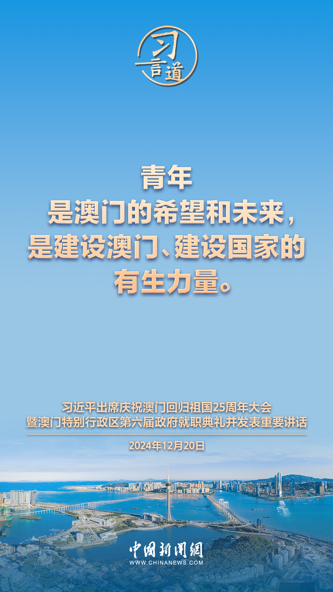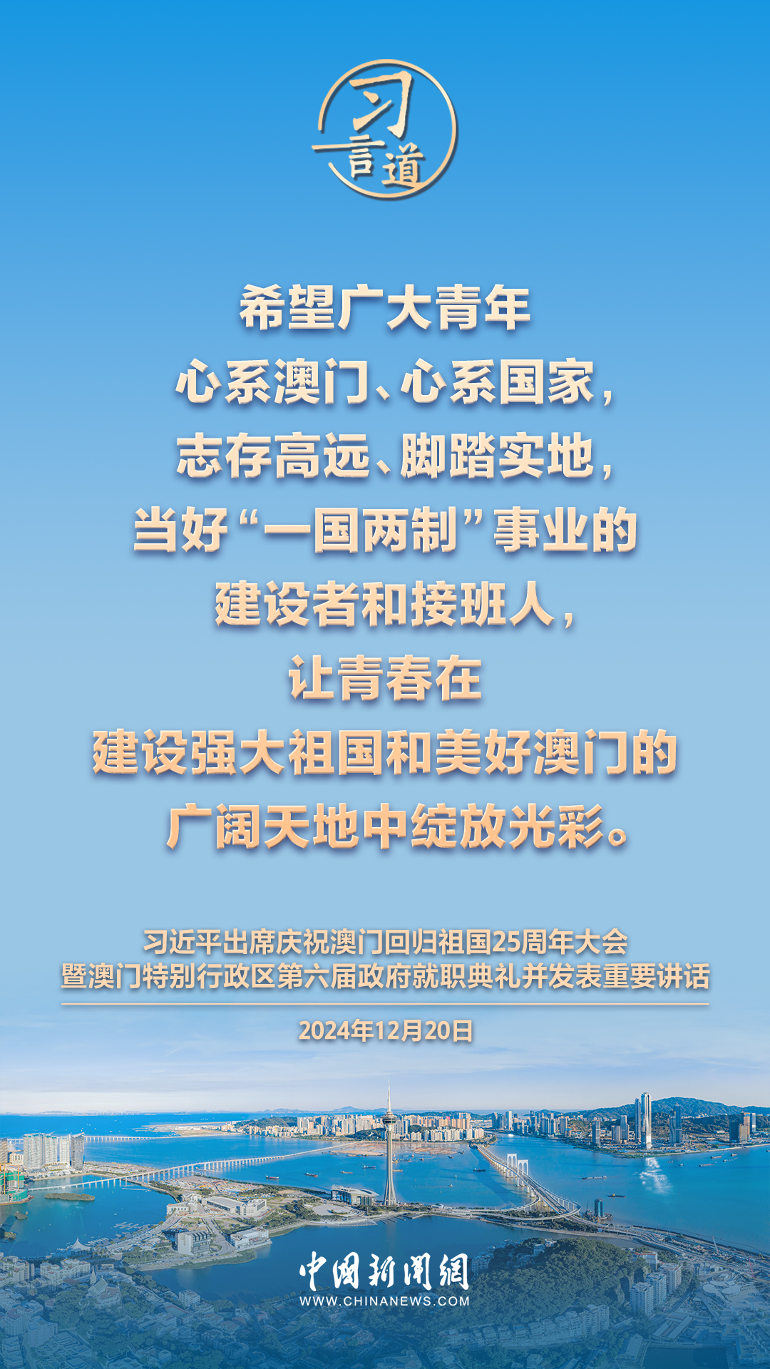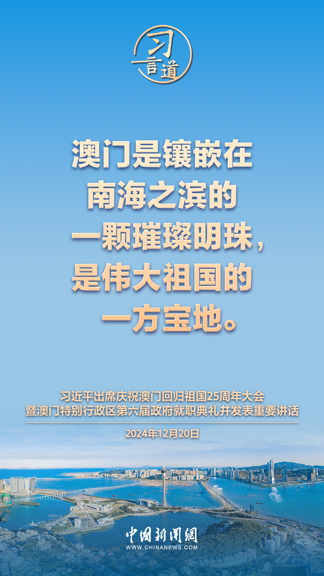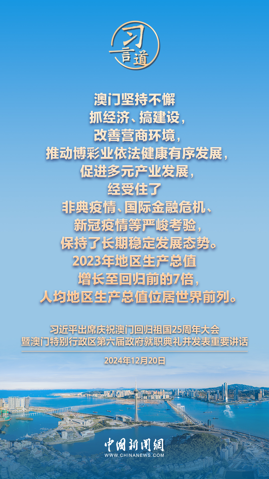 慶祝澳門回歸祖國25周年大會暨澳門特別行政區(qū)第六屆政府就職典禮20日在澳門東亞運動會體育館隆重舉行。中共中央總書記、國家主席、中央軍委主席習近平出席并發(fā)表重要講話,習近平指出——