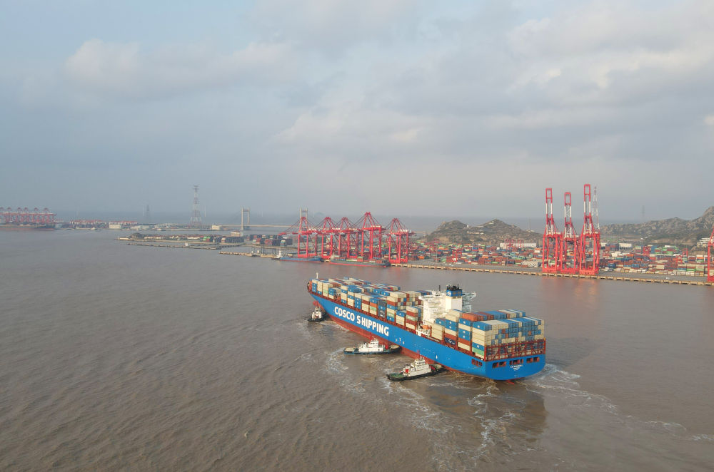 “新上?!陛喌诌_(dá)洋山港,這是自秘魯錢凱港開(kāi)港后首個(gè)“錢凱—上海”正式航次(2024年12月18日攝,無(wú)人機(jī)照片)。新華社記者 方喆 攝