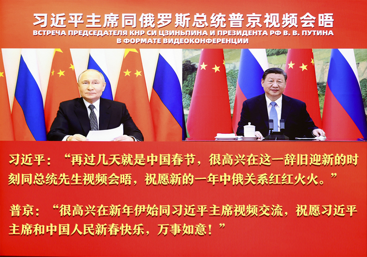 1月21日,中國國家主席習近平在北京同俄羅斯總統(tǒng)普京舉行視頻會晤,兩國元首互致新年祝福。習近平強調(diào),新的一年,我愿同總統(tǒng)先生一道,繼續(xù)引領(lǐng)中俄關(guān)系登高望遠,以中俄關(guān)系的穩(wěn)定性和堅韌性應對外部環(huán)境的不確定性,共同促進兩國發(fā)展振興,維護國際公平正義。
