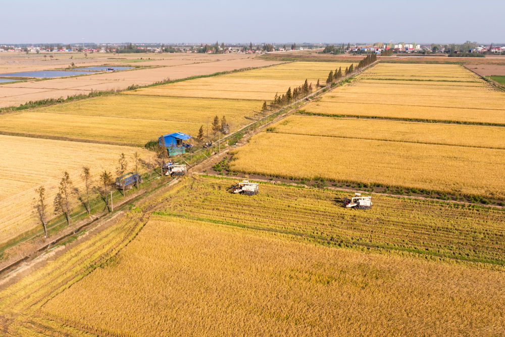 2024年11月1日,在湖南華容縣團(tuán)洲垸,村民駕駛收割機(jī)收獲水稻(無人機(jī)照片)。新華社記者陳思汗 攝