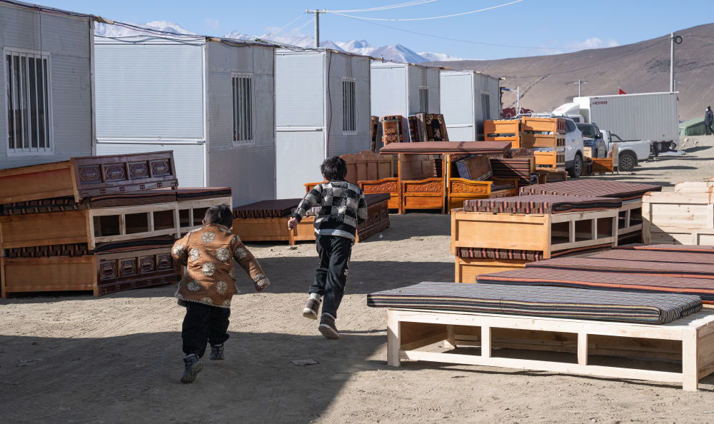 2025年1月13日,在定日縣嘎旦村,兩個孩子在剛運(yùn)來的兩排藏床間奔跑。新華社記者丁增尼達(dá) 攝