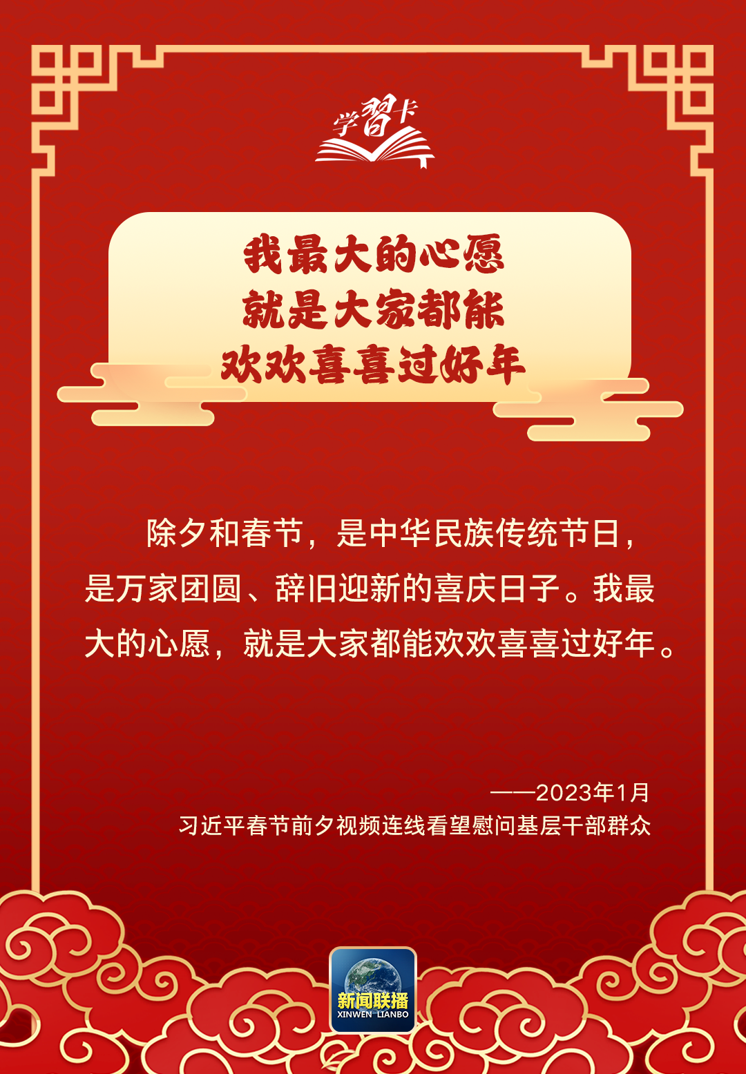習(xí)近平總書(shū)記曾說(shuō):“我最大的心愿,就是大家都能歡歡喜喜過(guò)好年?!痹谶@辭舊迎新、萬(wàn)家團(tuán)圓之際,讓我們聆聽(tīng)總書(shū)記的暖心話語(yǔ),一起學(xué)習(xí)↓