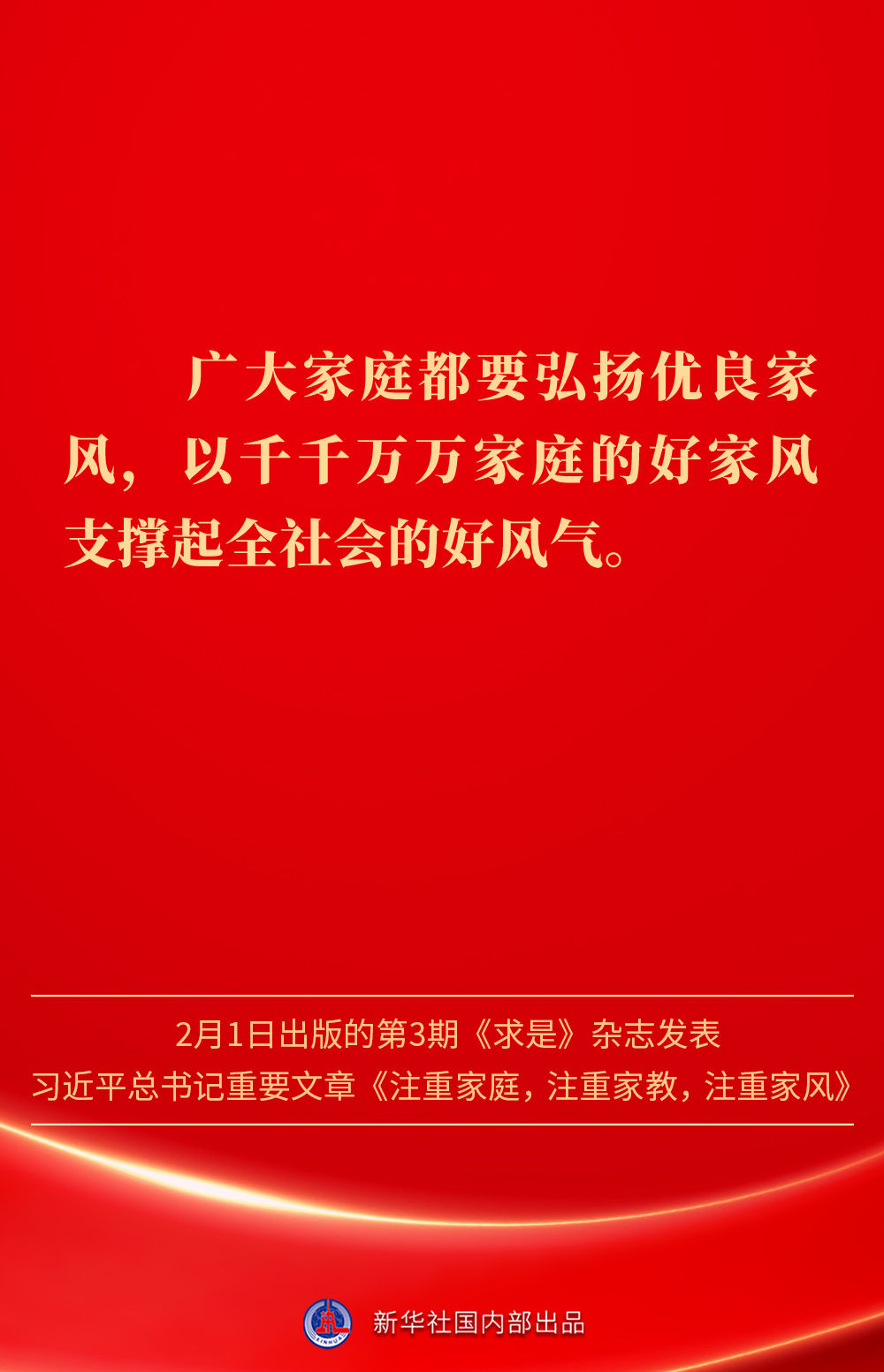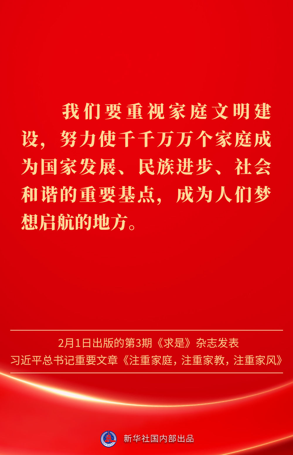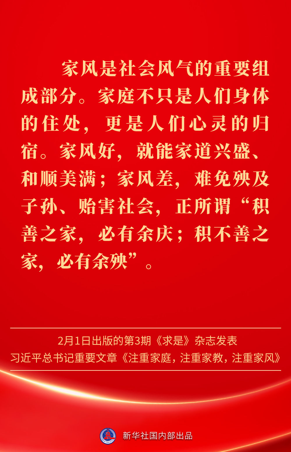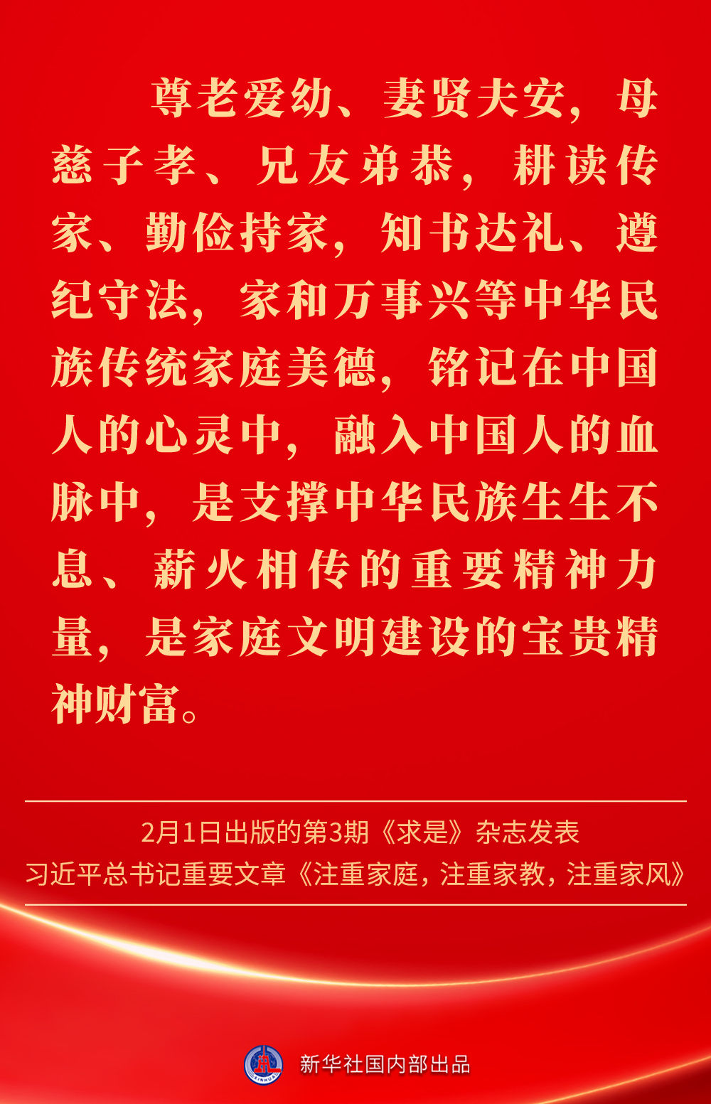 萬(wàn)家團(tuán)圓共慶新春佳節(jié)之際,2月1日出版的第3期《求是》雜志發(fā)表習(xí)近平總書(shū)記重要文章《注重家庭,注重家教,注重家風(fēng)》。為什么要注重家庭、家教、家風(fēng)?如何做好家庭文明建設(shè)?習(xí)近平總書(shū)記這樣闡述——