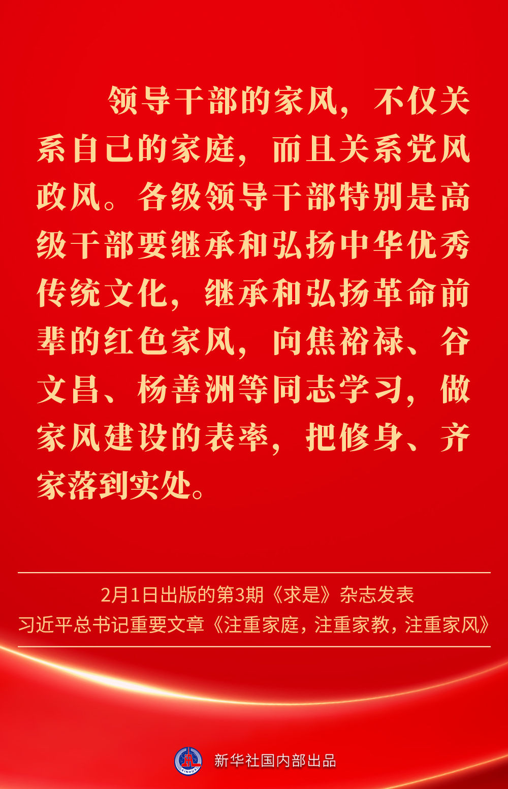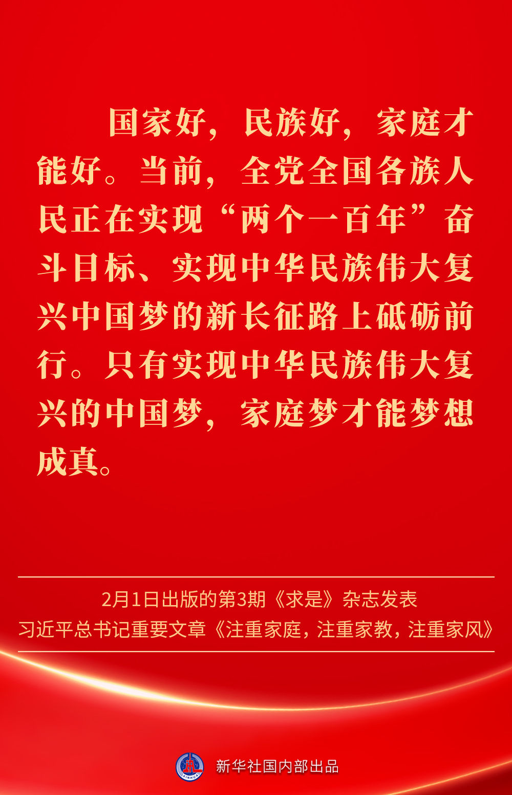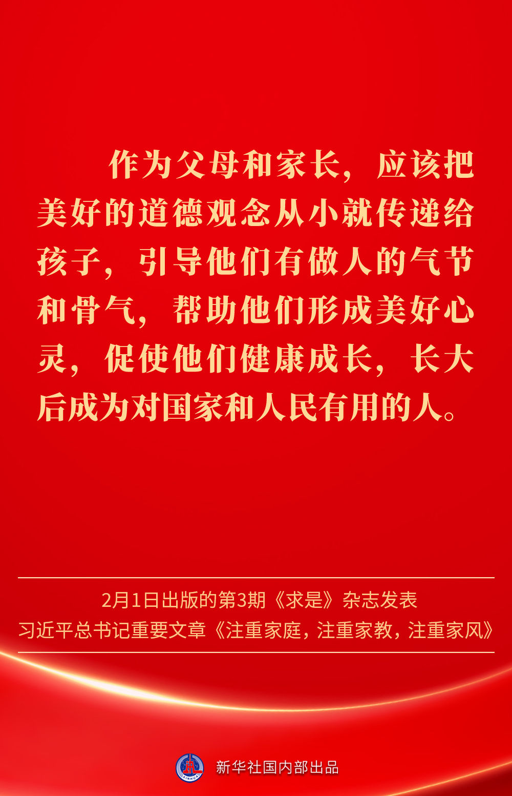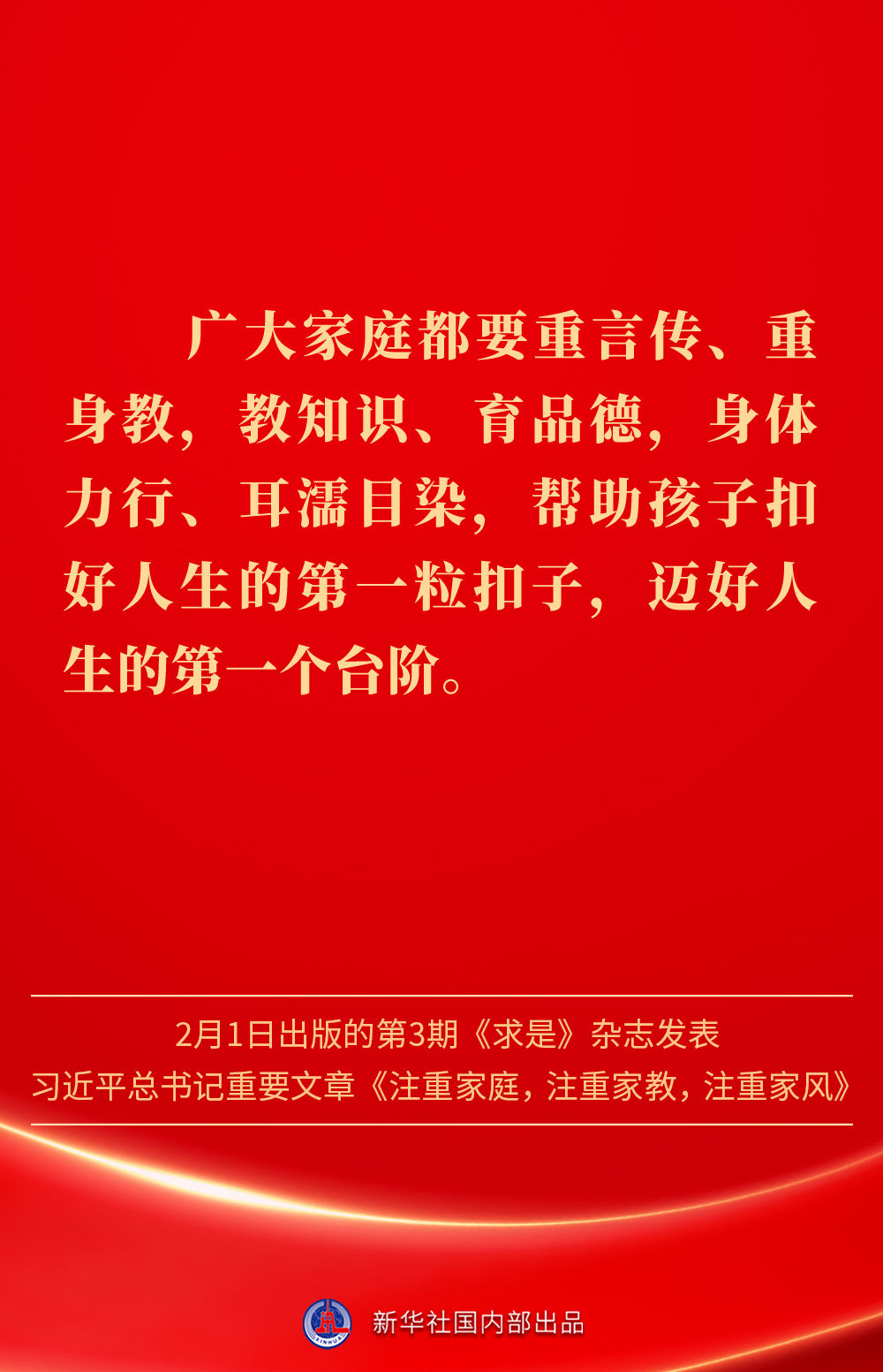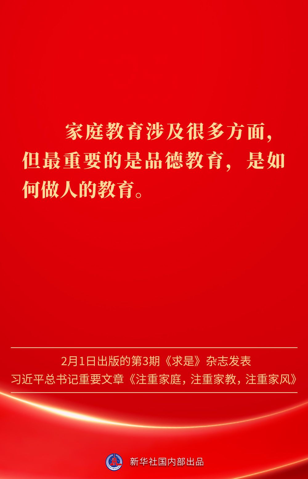 萬(wàn)家團(tuán)圓共慶新春佳節(jié)之際,2月1日出版的第3期《求是》雜志發(fā)表習(xí)近平總書(shū)記重要文章《注重家庭,注重家教,注重家風(fēng)》。為什么要注重家庭、家教、家風(fēng)?如何做好家庭文明建設(shè)?習(xí)近平總書(shū)記這樣闡述——