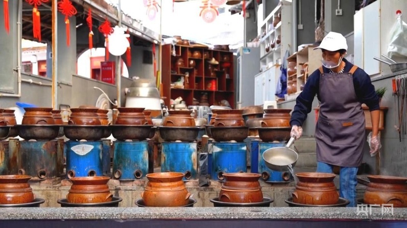 制作盬子雞的盬子,來自當(dāng)?shù)厥〖壏俏镔|(zhì)文化遺產(chǎn)代表性傳承人母先才的陶藝館。2014年,在政府的幫扶下,母先才依托傳統(tǒng)技藝開設(shè)了陶藝館。現(xiàn)在,他不僅把原來的土窯改成了更加環(huán)保的電窯,還把工坊變?yōu)榧铺?、研學(xué)、餐飲為一體的陶藝館,受到游客歡迎。