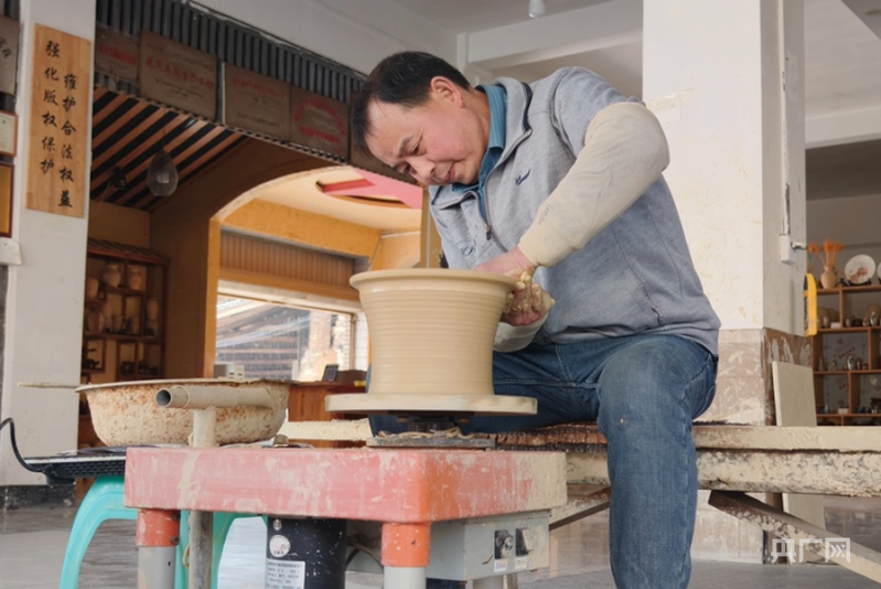 母先才在自己的陶藝館內(nèi)制作盬子(央廣網(wǎng)記者 欒小琳 攝)