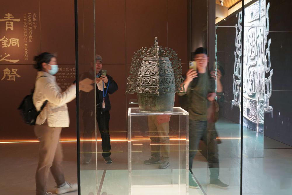2月26日,游客在西部機(jī)場博物館珍寶館內(nèi)參觀國家一級文物“秦公镈”。