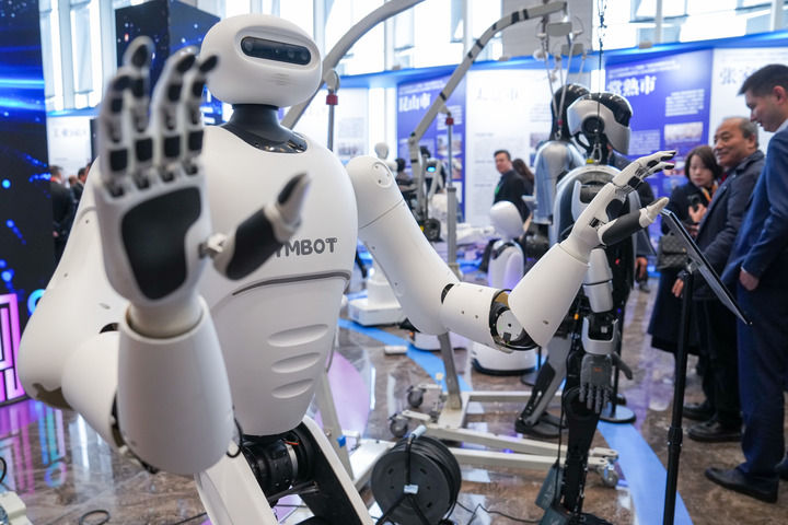 2025年2月14日在2025年蘇州市“人工智能+”創(chuàng)新發(fā)展推進(jìn)大會暨人工智能賦能新型工業(yè)化深度行(蘇州站)活動現(xiàn)場拍攝的人形機(jī)器人。新華社記者 李博 攝