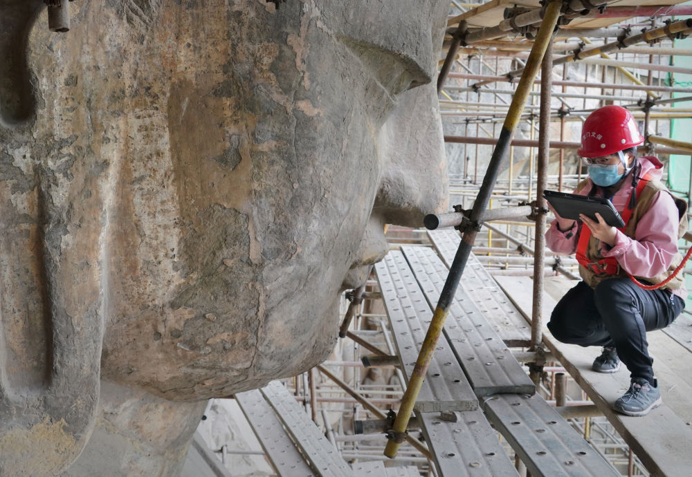 奉先寺位于河南洛陽龍門西山南段,是龍門石窟開鑿規(guī)模最大、最具代表性的摩崖像龕。2022年7月,龍門石窟奉先寺大型滲漏水治理和危巖體加固保護(hù)工程完工。這是工作人員在龍門石窟奉先寺進(jìn)行勘測作業(yè)(2022年4月14日攝)。