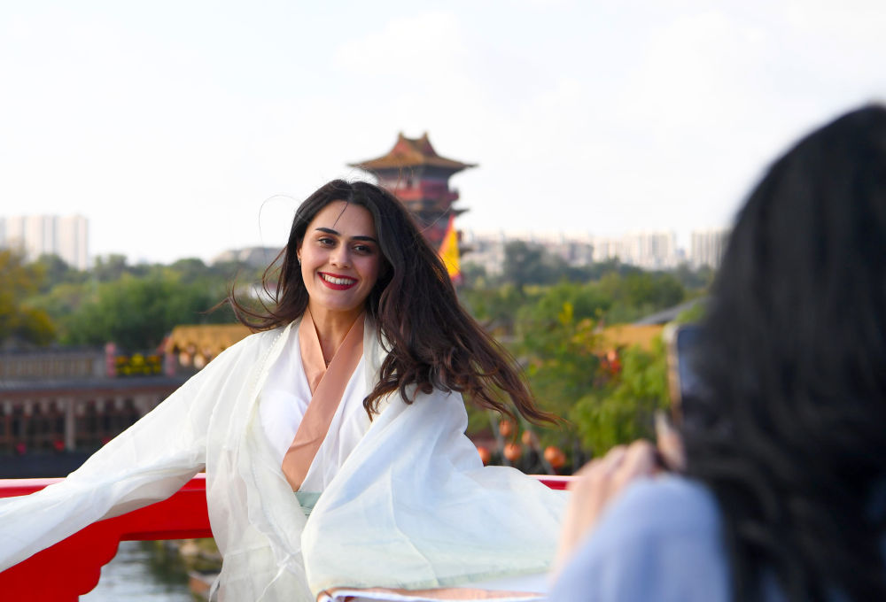 2023年10月24日,游客在洛陽市洛邑古城身著漢服拍照留念。