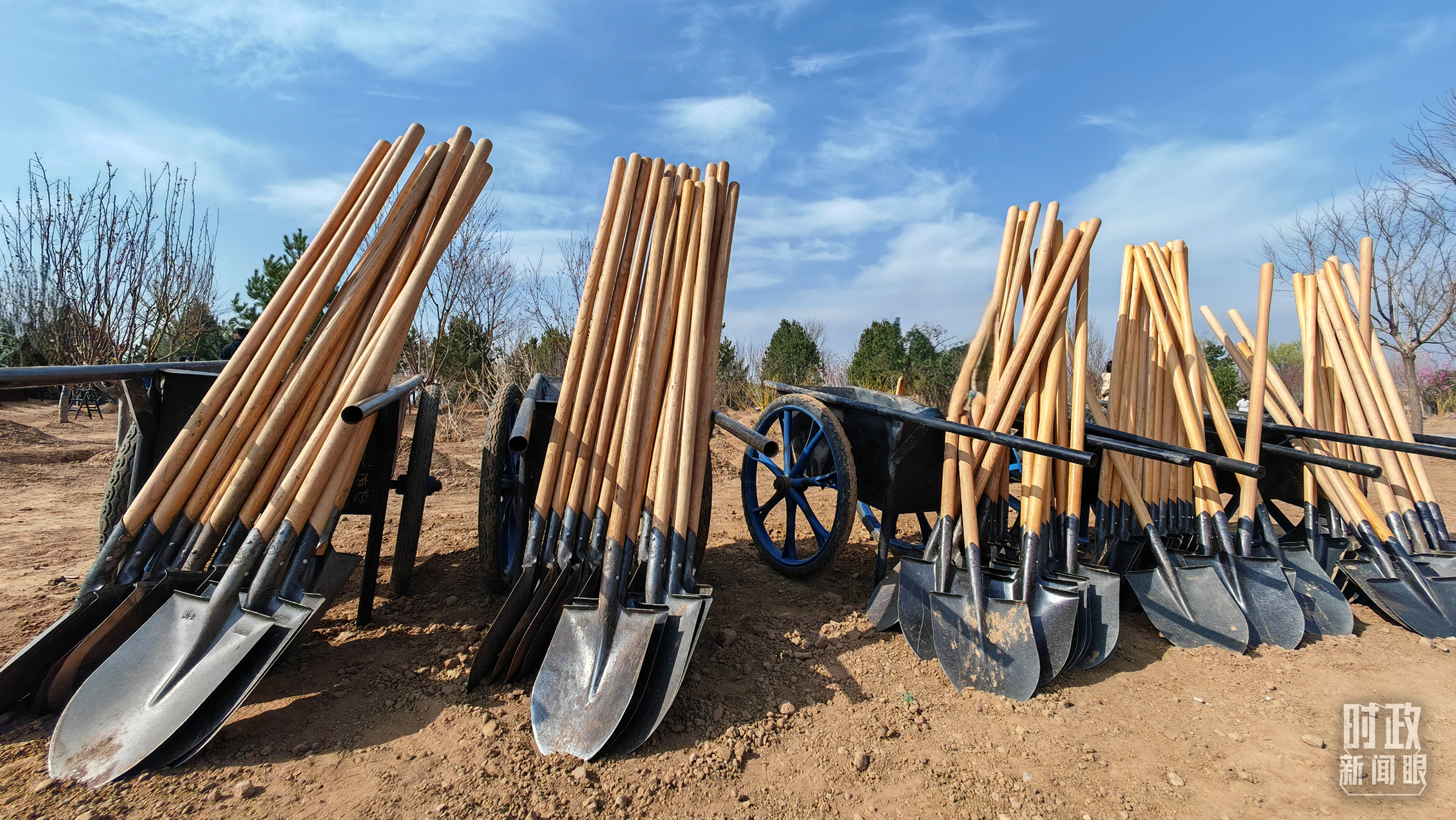 △植樹現(xiàn)場整齊擺放的工具。(總臺央視記者王策拍攝)