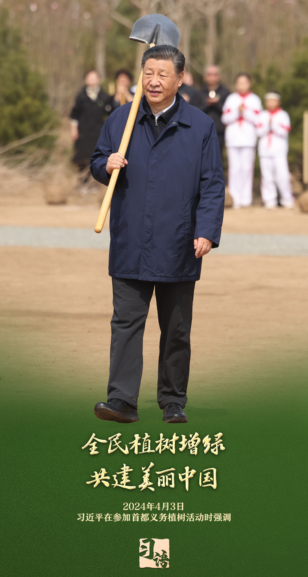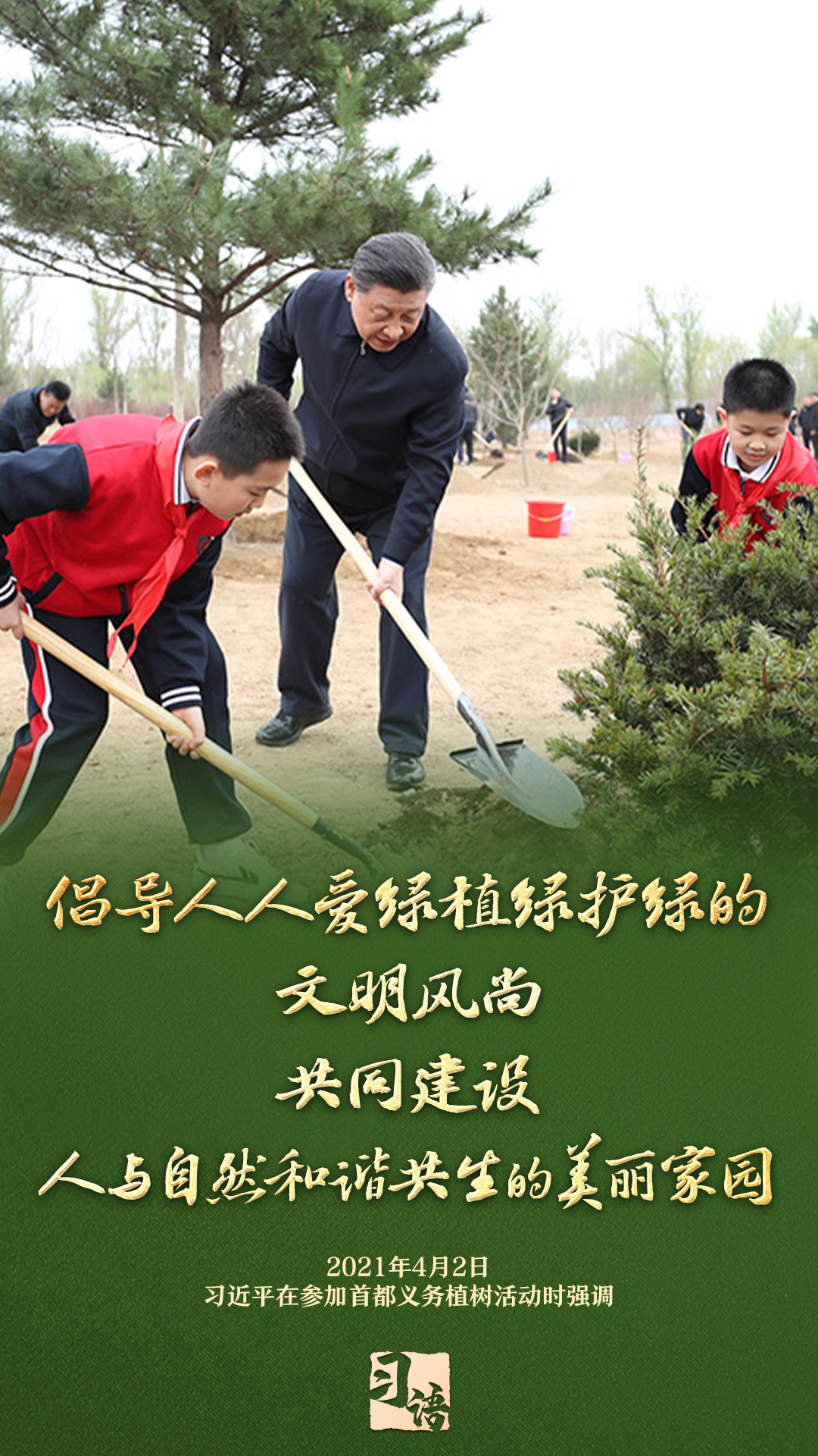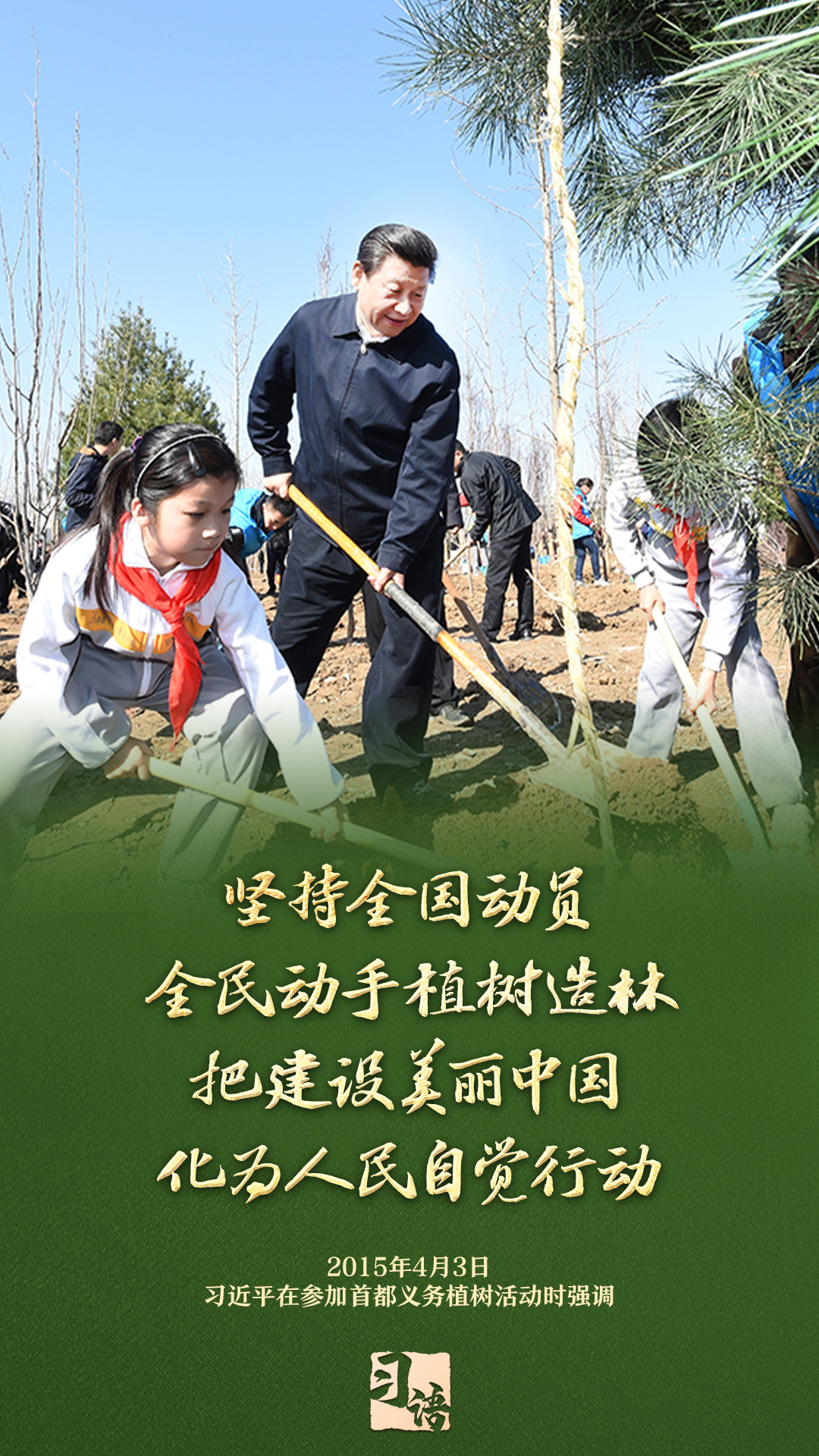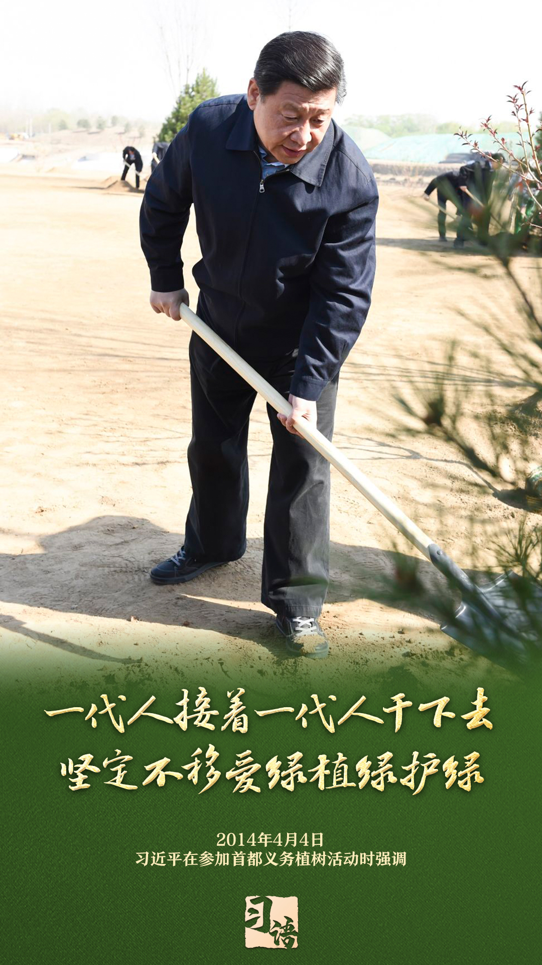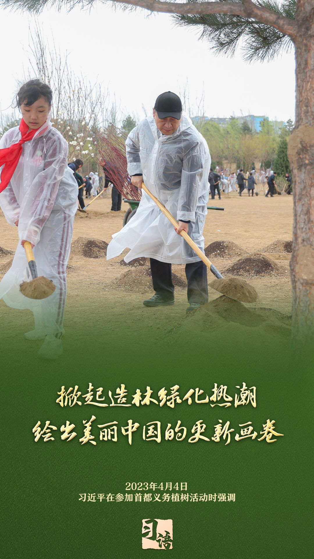 “植樹造林是一件很有意義的事情,是一項功在當代、利在千秋的崇高事業(yè),要一以貫之、持續(xù)做下去?!弊?013年以來的13個春天里,無論晴雨,習(xí)近平總書記都會拿起鐵鍬,與干部群眾一起參加首都義務(wù)植樹活動。鏟土造坑、培土圍堰、提水澆灌,總書記身體力行種下綠色的希望,對擴綠興綠護綠、建設(shè)美麗中國提出明確要求。一起學(xué)習(xí)。