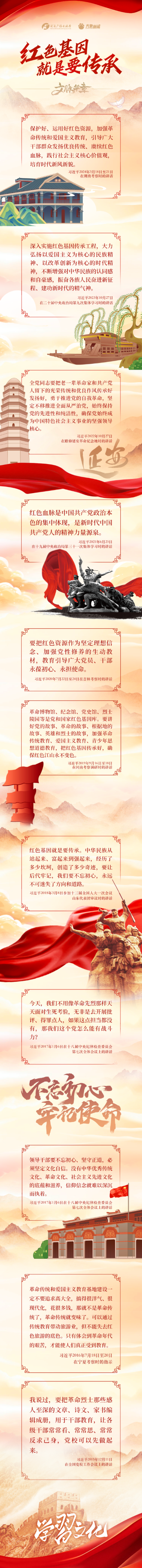 習(xí)近平總書記高度重視紅色基因傳承,發(fā)表了一系列重要講話,引導(dǎo)我們賡續(xù)紅色血脈,激發(fā)愛國熱情,振奮民族精神。我們一起學(xué)習(xí)。