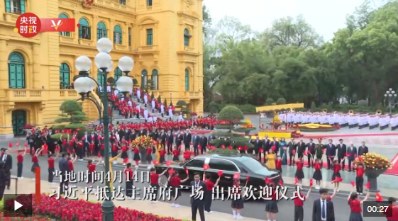 4月14日,中共中央總書記、國家主席習(xí)近平抵達(dá)河內(nèi)對越南進行國事訪問。當(dāng)日下午,越共中央總書記蘇林為習(xí)近平舉行隆重歡迎儀式。