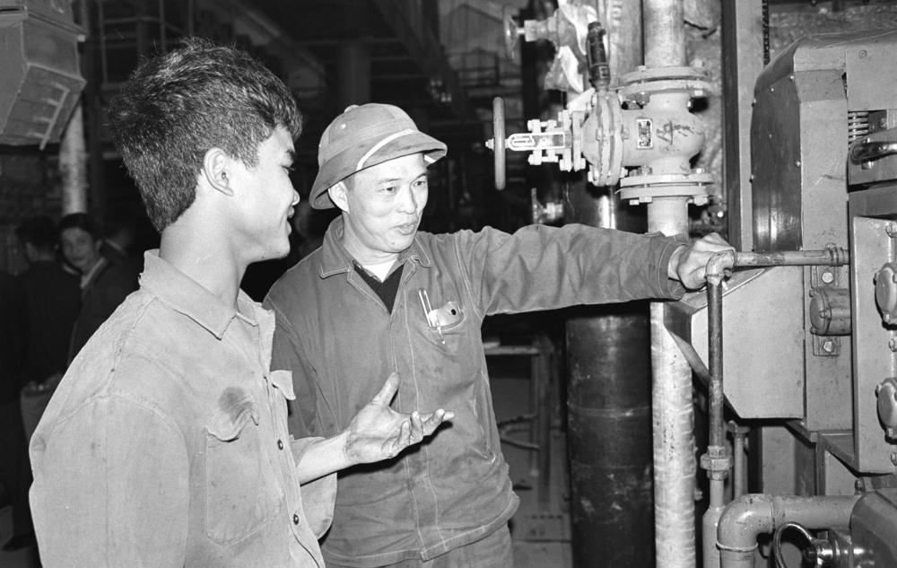 1976年,中國工程技術(shù)人員同越南工人在越南永富聯(lián)合紡織廠一起工作。