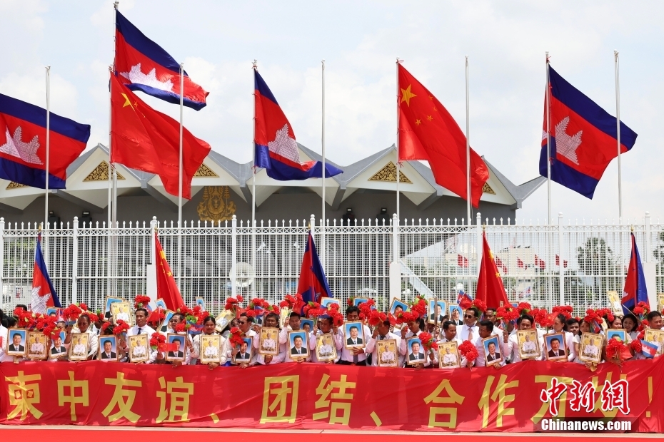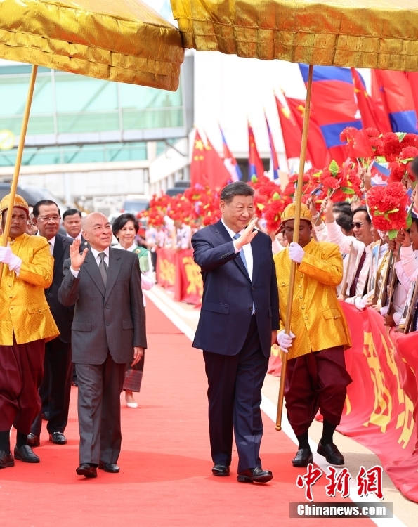 習(xí)近平抵達(dá)柬埔寨時,在停機(jī)坪現(xiàn)場,禮兵分列紅毯兩側(cè),軍樂團(tuán)奏起中柬兩國國歌,數(shù)百名當(dāng)?shù)孛癖姄]舞中柬國旗,歡迎鐵桿朋友再次到訪。