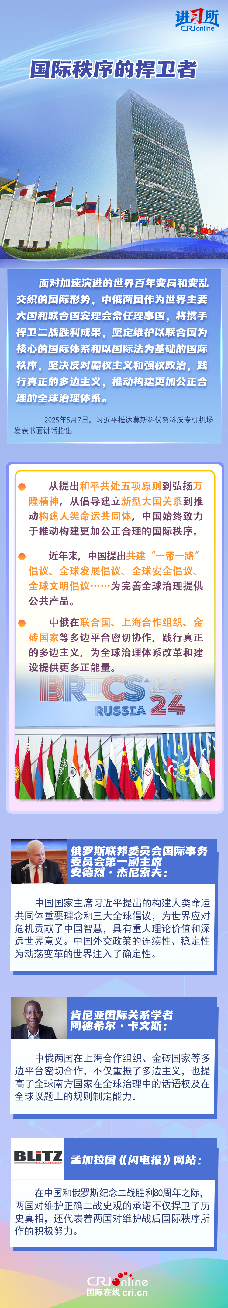 “兩國(guó)人民用鮮血和生命凝結(jié)的深厚情誼,如黃河之水奔騰不息,似伏爾加河寬廣深沉,成為中俄世代友好的不竭源泉。”今年是中國(guó)人民抗日戰(zhàn)爭(zhēng)、蘇聯(lián)偉大衛(wèi)國(guó)戰(zhàn)爭(zhēng)暨世界反法西斯戰(zhàn)爭(zhēng)勝利80周年,也是聯(lián)合國(guó)成立80周年。在這一重要?dú)v史時(shí)間節(jié)點(diǎn),習(xí)近平主席此訪不僅為中俄關(guān)系發(fā)展注入強(qiáng)勁動(dòng)力,也向世界宣示中俄兩國(guó)攜手捍衛(wèi)二戰(zhàn)勝利成果的堅(jiān)定意志。