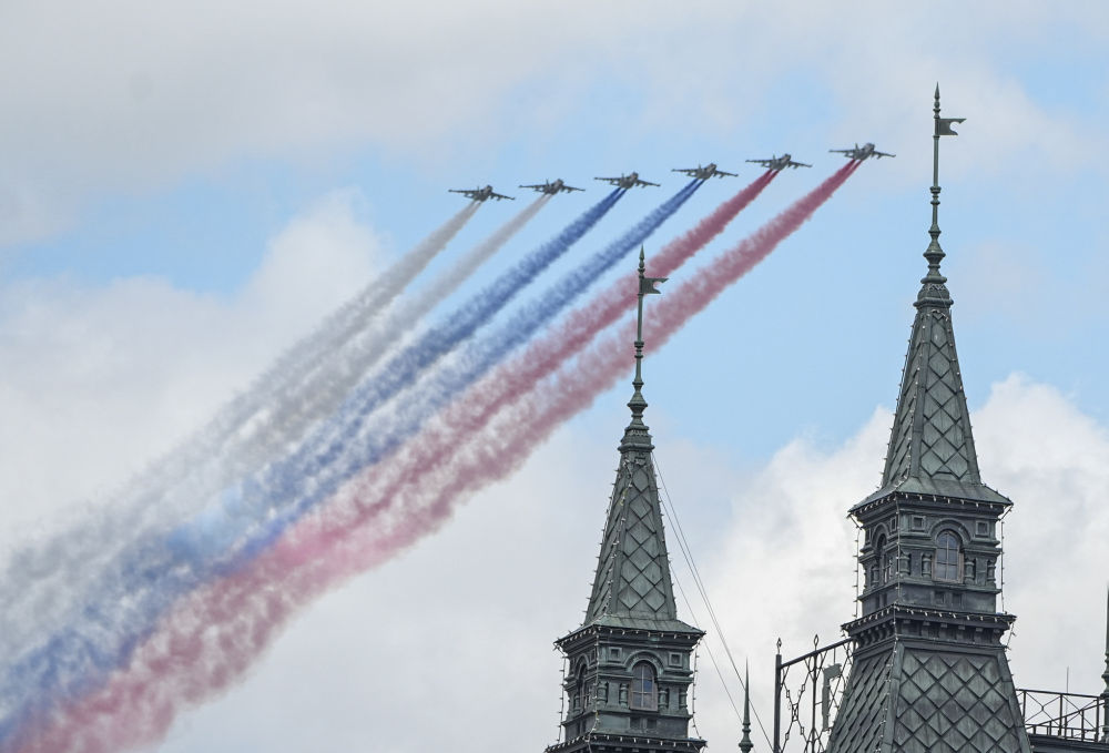 5月9日,在俄羅斯首都莫斯科,參加紀(jì)念蘇聯(lián)偉大衛(wèi)國戰(zhàn)爭勝利80周年閱兵式的戰(zhàn)機(jī)編隊(duì)拉煙飛行。新華社記者 賴向東 攝