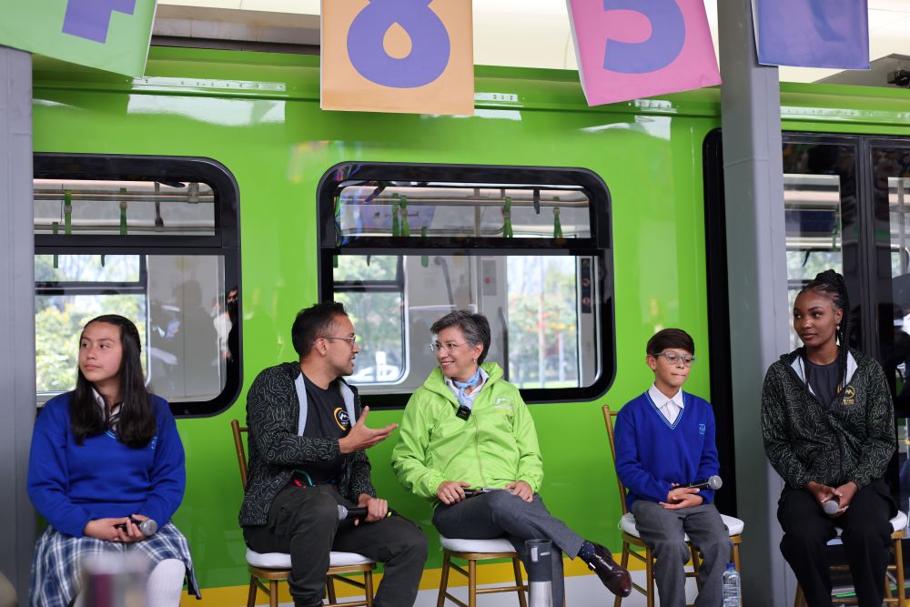 2023年8月10日,哥倫比亞波哥大市長(zhǎng)克勞迪婭·洛佩斯(中)在波哥大地鐵的模型車廂旁跟參加活動(dòng)的師生交流。按照計(jì)劃,由中企承建和運(yùn)營(yíng)的波哥大地鐵一號(hào)線將在2028年正式投入運(yùn)營(yíng)。