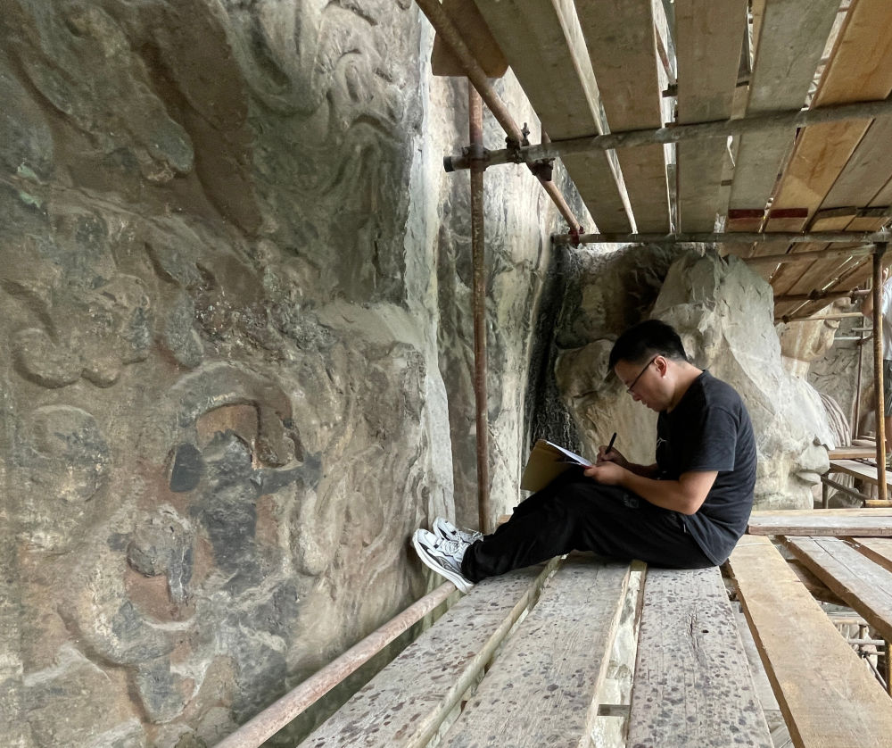 習近平總書記來到龍門石窟時,龍門石窟研究院考古研究中心工作人員谷宏耀正和其他部門同事共同對石窟進行調(diào)查記錄。