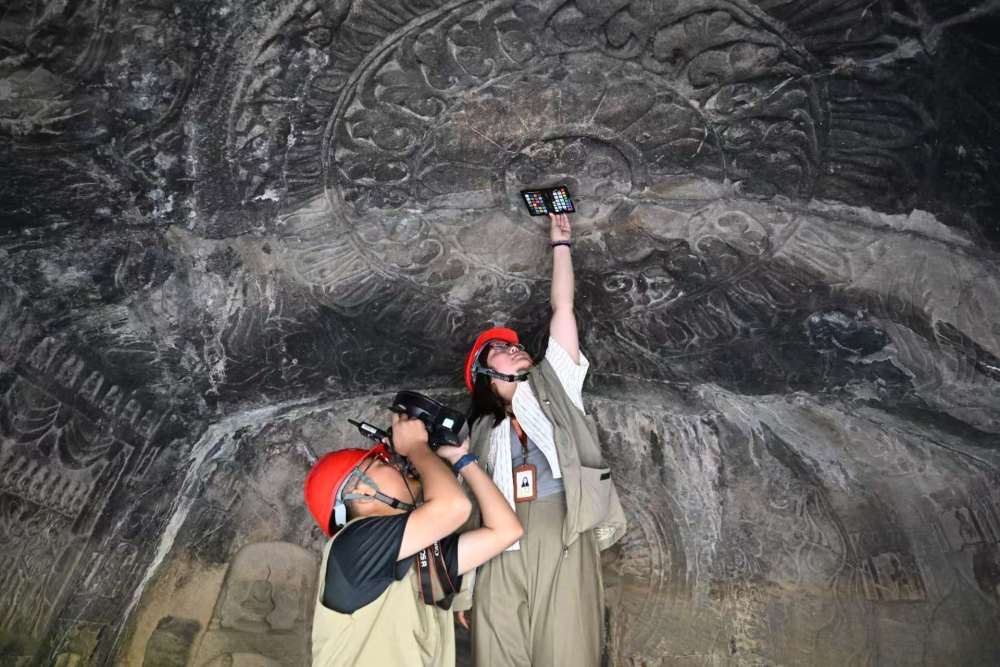4月10日,龍門石窟研究院工作人員(右)與武漢大學文化遺產(chǎn)智能計算實驗室團隊成員一同對龍門石窟魏字洞進行高清攝影掃描。新華社記者 李嘉南 攝