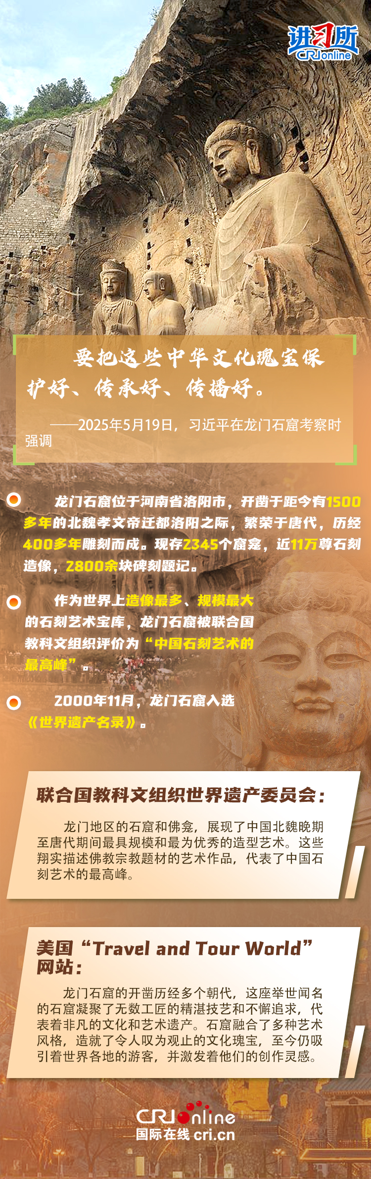 龍門石窟被聯(lián)合國教科文組織評價為“中國石刻藝術(shù)的最高峰”,與敦煌莫高窟、云岡石窟、麥積山石窟并稱為“中國四大石窟”,具有重要歷史價值、文化價值。近年來,習(xí)近平先后考察了中國四大石窟。對這些承載著中華民族文化基因和血脈的文物和文化遺產(chǎn),習(xí)近平強(qiáng)調(diào),“保護(hù)好、傳承好歷史文化遺產(chǎn)是對歷史負(fù)責(zé)、對人民負(fù)責(zé)?!?/p>