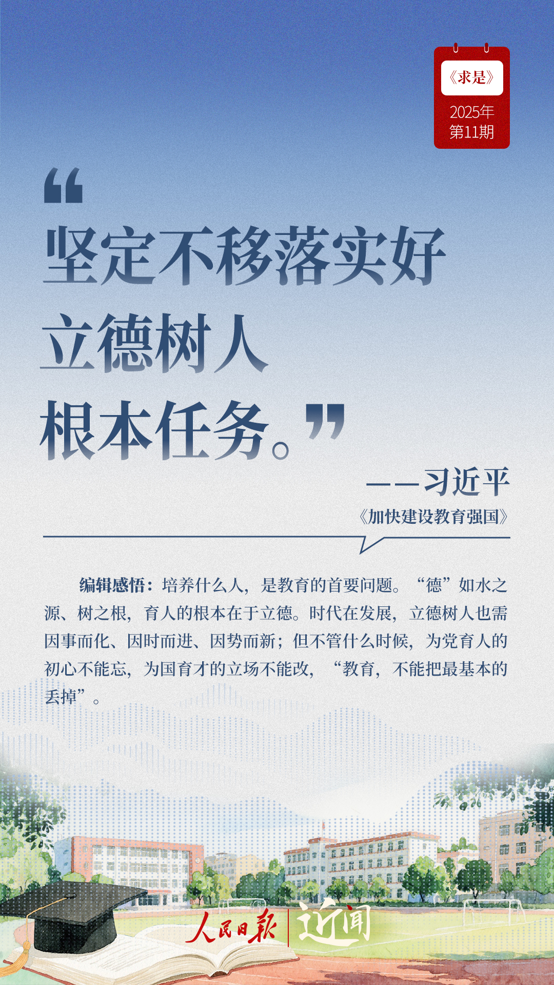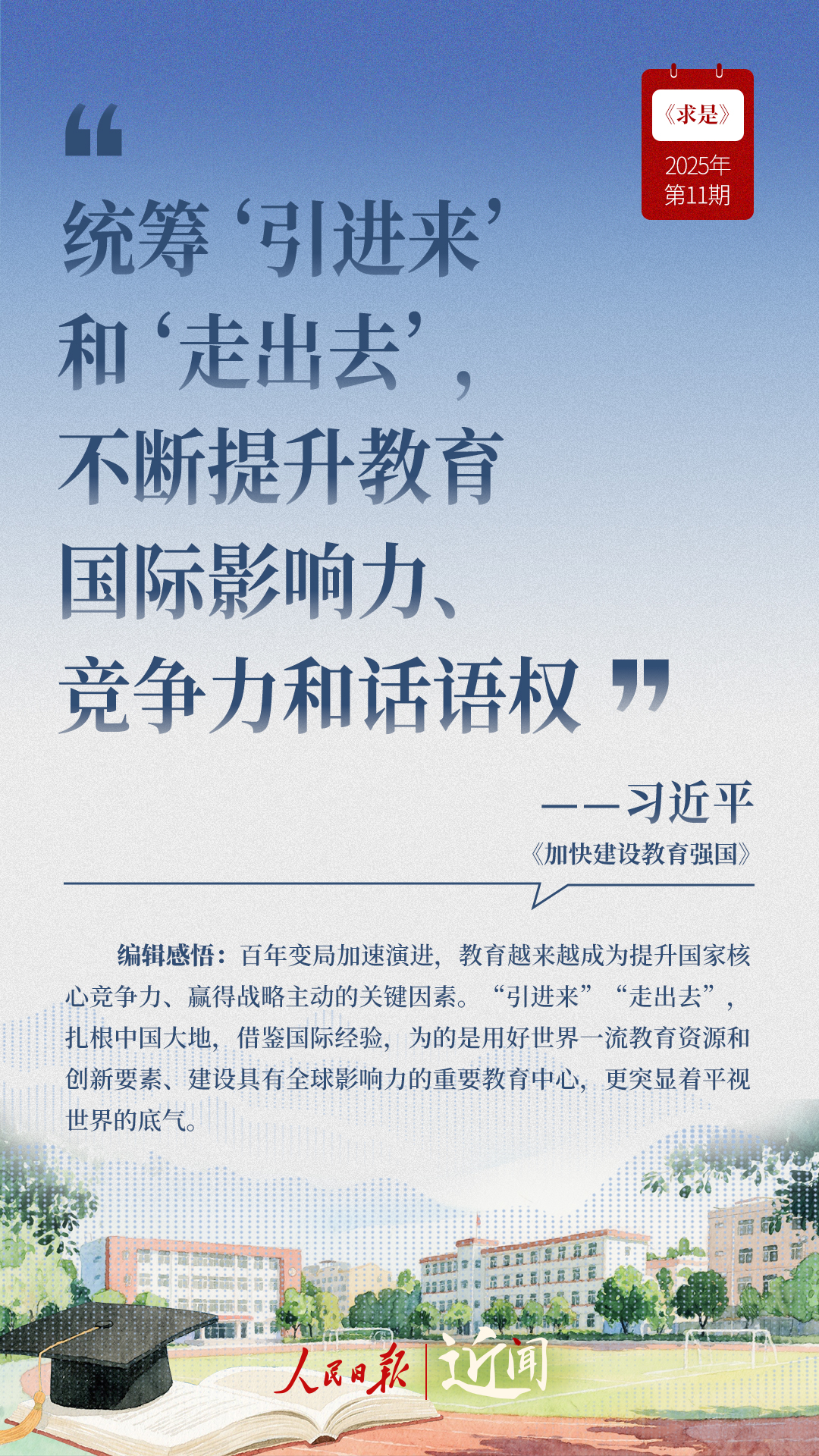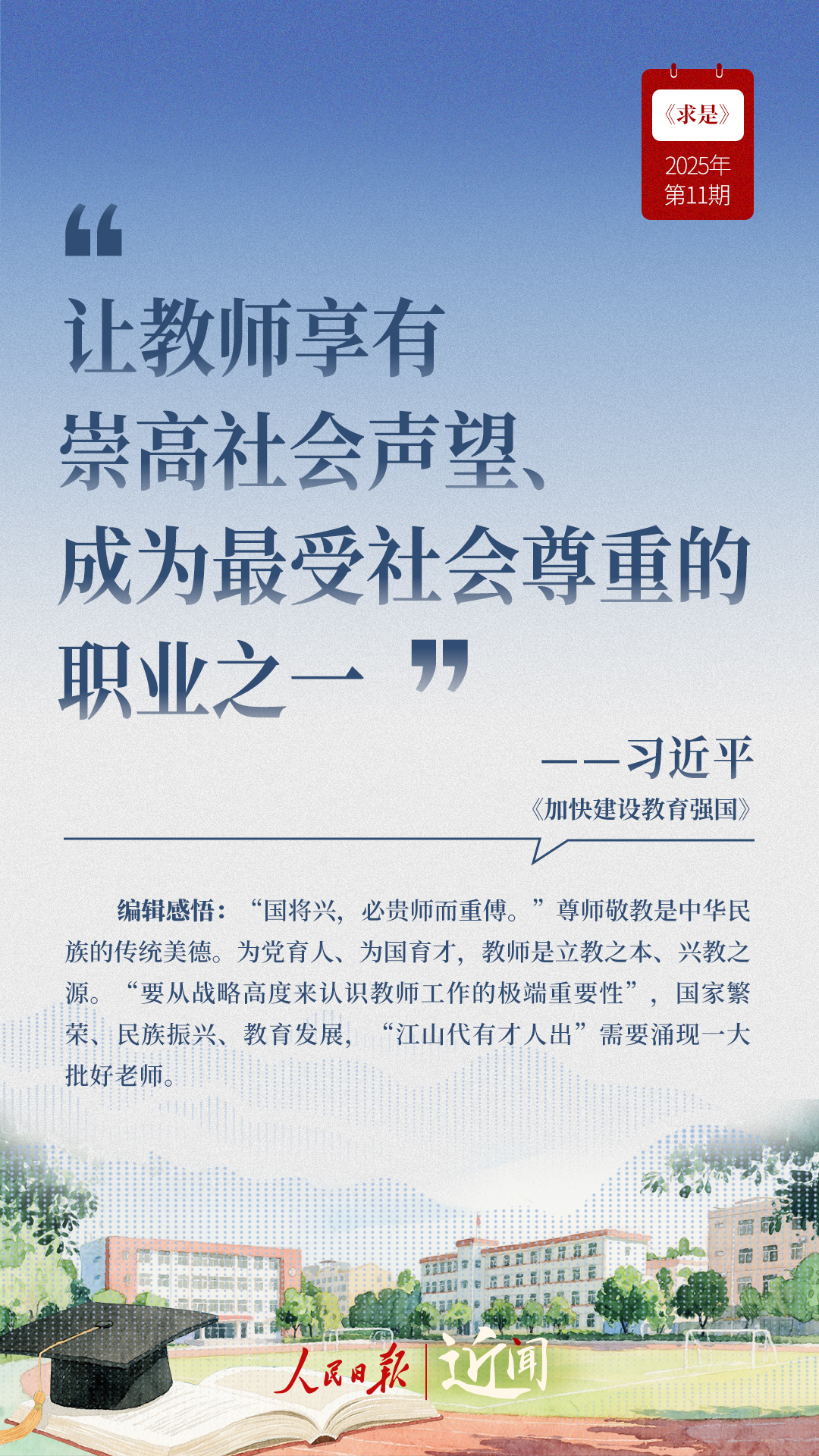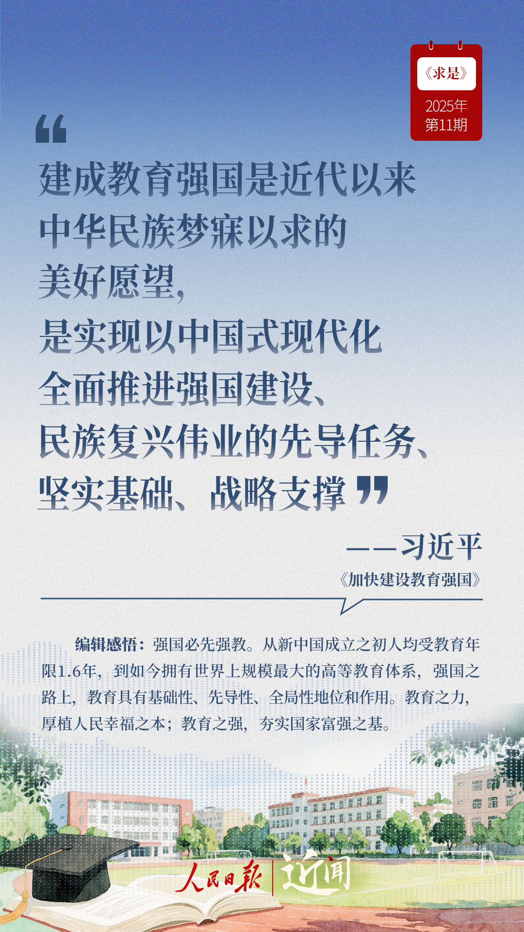 教育是國之大計(jì)、黨之大計(jì)。日前,《求是》雜志發(fā)表習(xí)近平總書記重要文章《加快建設(shè)教育強(qiáng)國》?!叭姘盐战逃恼螌傩浴⑷嗣駥傩?、戰(zhàn)略屬性”“讓教育改革發(fā)展成果更多更公平惠及全體人民”“讓教師享有崇高社會(huì)聲望、成為最受社會(huì)尊重的職業(yè)之一”……通過這些話,一起感悟習(xí)近平總書記對(duì)教育強(qiáng)國建設(shè)的謀劃與部署。
