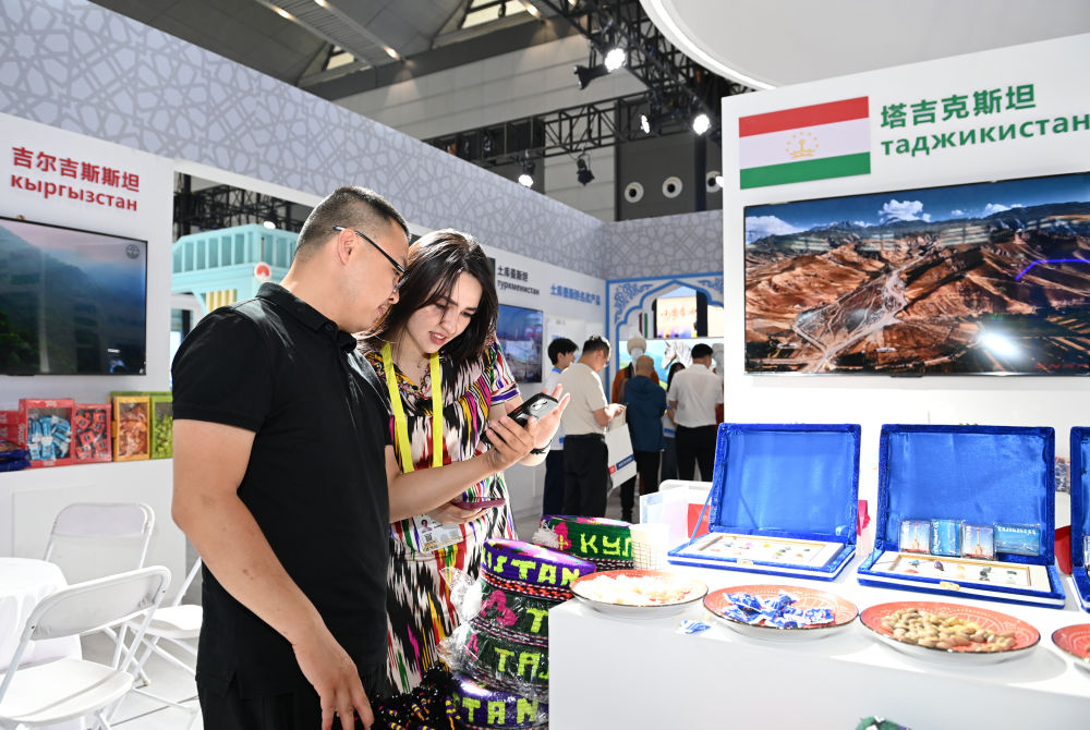 2025年5月21日,在第九屆絲綢之路國(guó)際博覽會(huì)暨中國(guó)東西部合作與投資貿(mào)易洽談會(huì)絲路優(yōu)品展上,參觀者了解塔吉克斯坦商品。新華社記者 李一博 攝