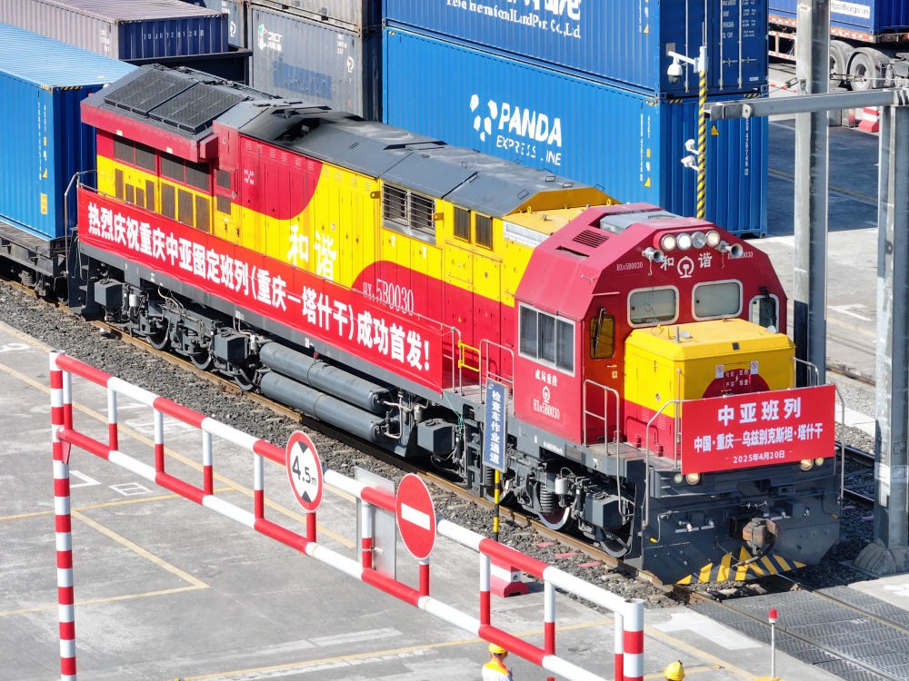 4月20日,圖定中亞班列在重慶團結村中心站等候發(fā)車(無人機照片)。新華社記者 唐奕 攝