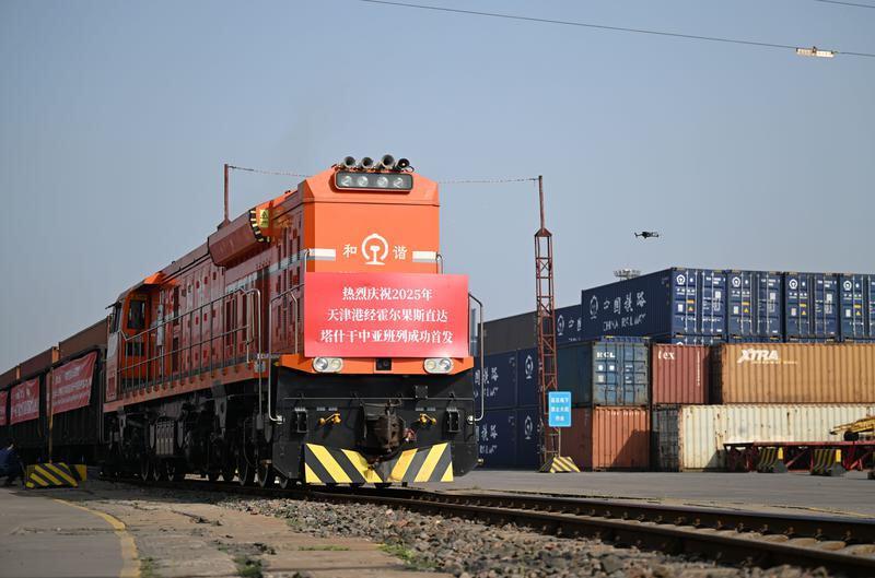 △5月20日,2025年首列天津港經(jīng)霍爾果斯直達(dá)塔什干的中亞班列從天津港物捷三堆場(chǎng)發(fā)車。