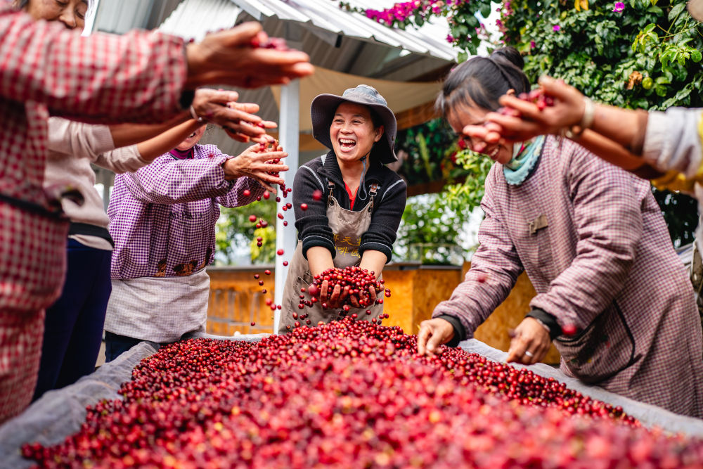 在云南省普洱市思茅區(qū)天玉咖啡莊園,莊園經(jīng)營者玉噸(中)和工作人員慶??Х蓉S收(2025年1月8日攝)。新華社記者 胡超 攝