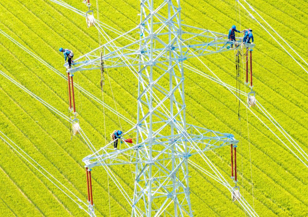 2025年5月4日,電力施工人員在江蘇省揚州市江都區(qū)武堅鎮(zhèn)至江蘇省興化經(jīng)濟開發(fā)區(qū)的220千伏華電武堅25萬千瓦集中式光伏項目配套輸電線路上作業(yè)(無人機照片)。新華社發(fā)(任飛攝)