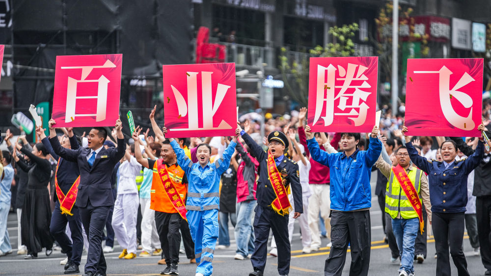 2025年5月18日,貴州民族團結(jié)大巡游活動在貴州省貴陽市舉行。這是奮斗之光方陣的表演隊伍在進行巡游。新華社記者 陶亮 攝
