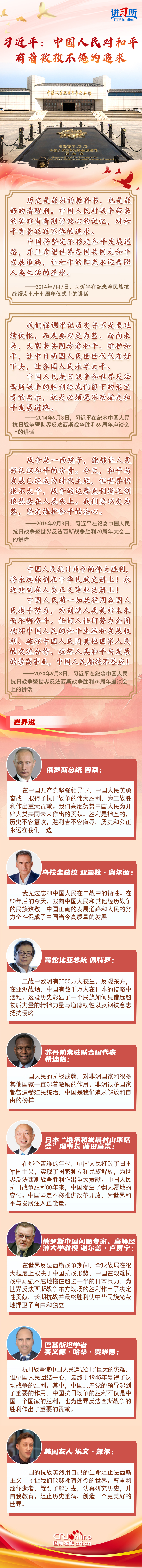 “中國(guó)人民抗日戰(zhàn)爭(zhēng)和世界反法西斯戰(zhàn)爭(zhēng)的勝利給我們留下的最寶貴的啟示,就是必須毫不動(dòng)搖走和平發(fā)展道路。”作為世界上唯一將和平發(fā)展寫入憲法和執(zhí)政黨黨章、上升為國(guó)家意志的大國(guó),中國(guó)始終從歷史中汲取智慧和力量,堅(jiān)定捍衛(wèi)來之不易的勝利成果。在國(guó)際友好人士眼中,中國(guó)為世界反法西斯戰(zhàn)爭(zhēng)東方戰(zhàn)場(chǎng)的勝利作出了決定性貢獻(xiàn),中國(guó)正確的發(fā)展道路和人民的努力奮斗促成了中國(guó)當(dāng)今高質(zhì)量的發(fā)展,為世界和平與發(fā)展注入正能量。