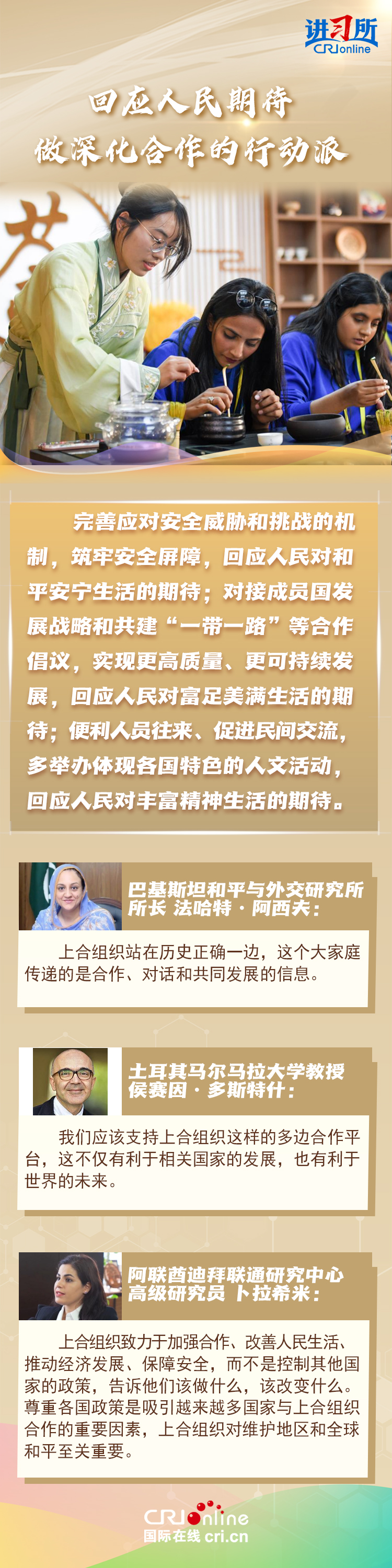 “讓‘上海精神’持續(xù)照亮構(gòu)建上海合作組織命運(yùn)共同體之路。”上海合作組織成立24年來,始終秉持“上海精神”,成功走出了一條順應(yīng)時(shí)代潮流、契合各方需求的區(qū)域合作道路,樹立起新型國際關(guān)系的典范。在國際人士眼中,上海合作組織站在歷史正確一邊,致力于建設(shè)一個(gè)更加平等,更加包容,更加公平公正的世界,對維護(hù)地區(qū)和全球和平至關(guān)重要。