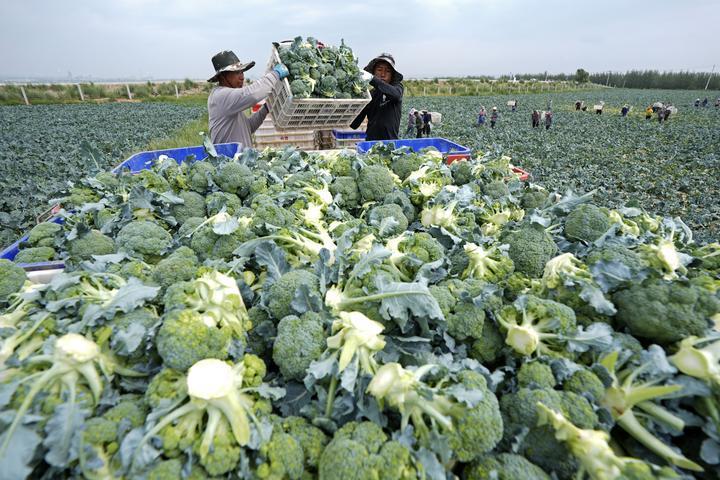 2025年7月18日,工作人員在寧夏固原市原州區(qū)彭堡鎮(zhèn)萬(wàn)畝冷涼蔬菜基地運(yùn)輸西蘭花。固原依托高海拔、氣候冷涼等“冷資源”優(yōu)勢(shì),大力發(fā)展冷涼蔬菜產(chǎn)業(yè),著力打造“六盤(pán)山冷涼蔬菜”區(qū)域公用品牌。目前已建成冷涼蔬菜規(guī)?;N植基地130余個(gè),種植面積穩(wěn)定在50萬(wàn)畝,年產(chǎn)鮮菜200萬(wàn)噸以上?!傲P(pán)山冷涼蔬菜”這張打造的“綠色名片”,已成為當(dāng)?shù)剜l(xiāng)村振興發(fā)展之路上的“熱產(chǎn)業(yè)”