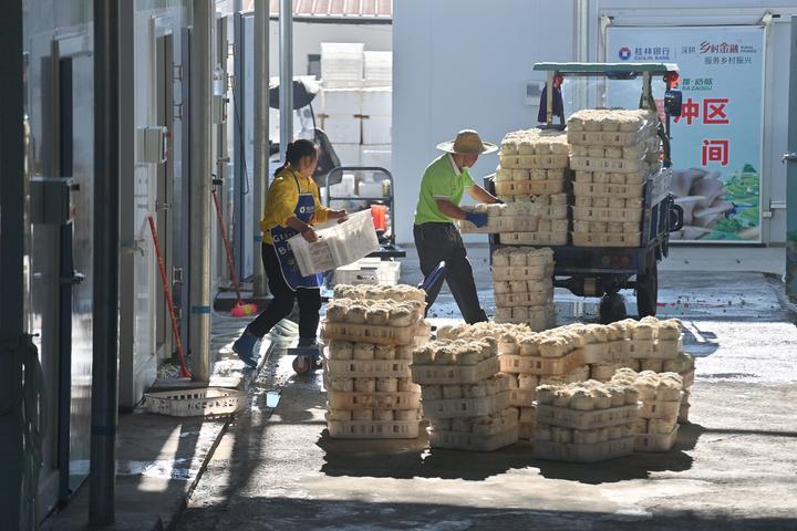 2024年10月31日,村民在廣西百色市德保縣那造村食用菌生產(chǎn)基地搬運(yùn)采摘的蘑菇。那造村通過(guò)做優(yōu)特色產(chǎn)業(yè)、豐富村民生活、完善基礎(chǔ)設(shè)施等多項(xiàng)具體舉措,推動(dòng)各項(xiàng)事業(yè)快速發(fā)展。