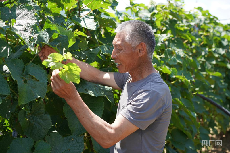 張國(guó)利為葡萄藤疏除過(guò)密枝條(央廣網(wǎng)記者 李春雪 攝)