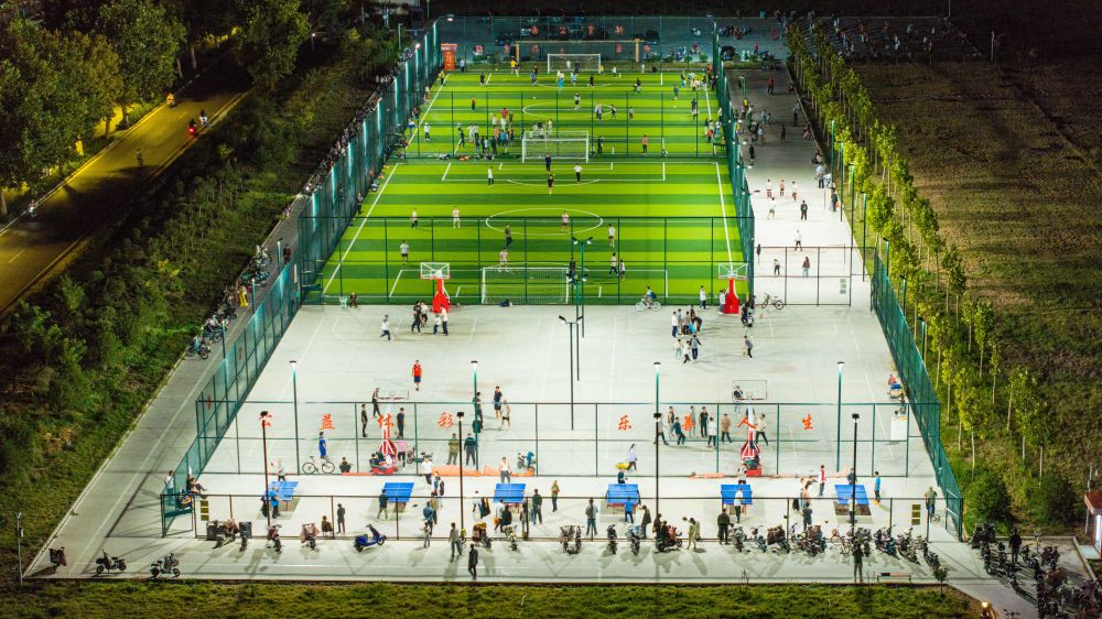 2024年9月21日,居民在山東省寧陽縣城區(qū)一處體育公園內運動(無人機照片)。近年來,寧陽縣充分利用城市空閑區(qū)域,新建或改建體育健身公園,為居民打造“10分鐘體育健身圈”,讓城市的“金角銀邊”成為全民健身大舞臺。