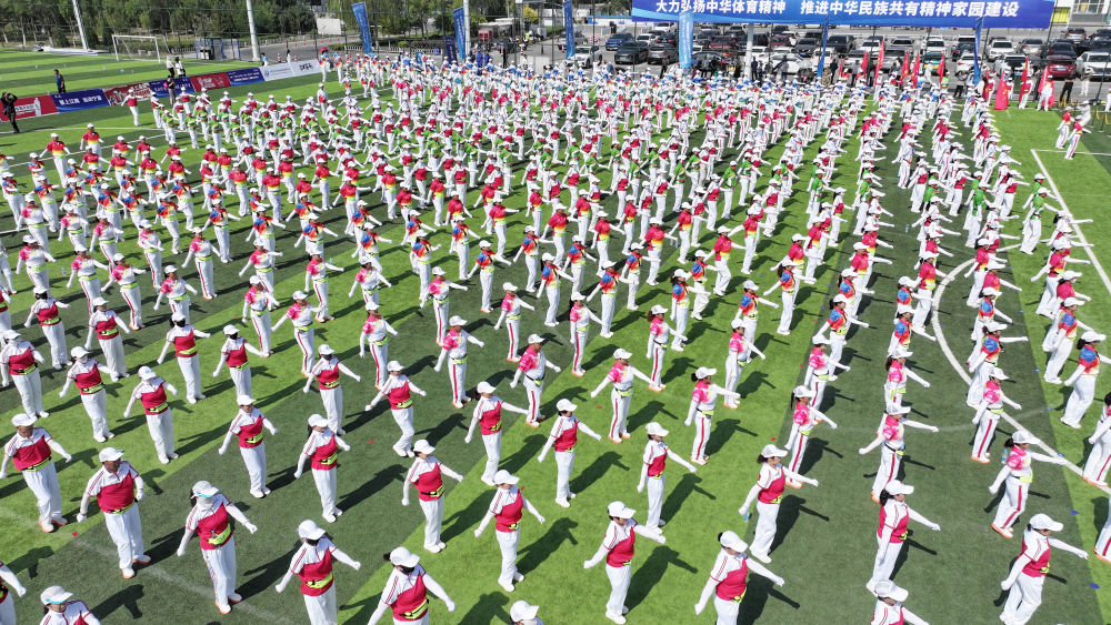 2025年6月10日,群眾在寧夏銀川市金鳳區(qū)覽山公園參加千人健身操展演(無人機照片)。當日,紀念“發(fā)展體育運動 增強人民體質”題詞73周年全民健身主題活動在覽山公園舉行