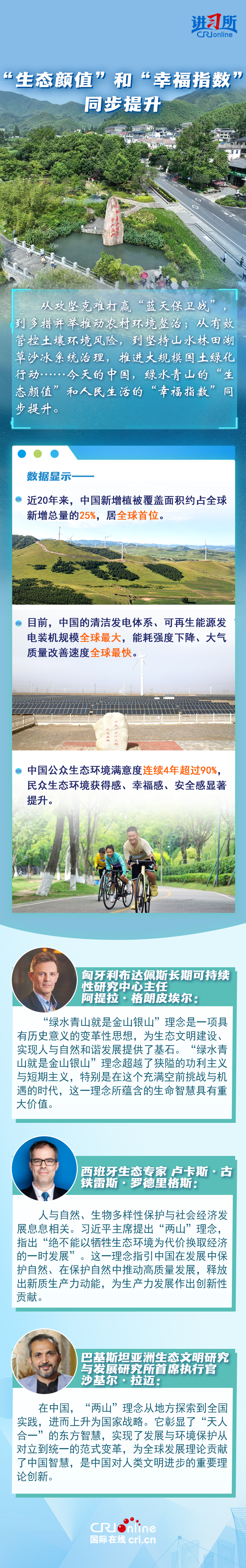“從歷史長河來看,如果說我們這一代人能留給后人點什么,我看生態(tài)文明建設(shè)就是很重要的一個方面。生態(tài)文明建設(shè)最能給老百姓帶來獲得感,環(huán)境改善了,老百姓體會也最深?!?0年前,時任中共浙江省委書記的習(xí)近平在安吉余村考察時,肯定了余村下定決心關(guān)閉礦區(qū)、全面走綠色發(fā)展之路的做法,并首次提出“綠水青山就是金山銀山”重要理念,20年來,這一重要理念帶給中國大地一場革命性變化,直接推動美麗中國建設(shè)取得歷史性成就。