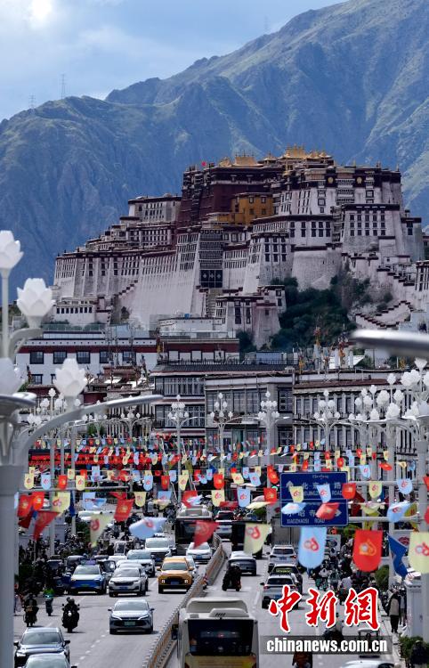 8月19日,隨著西藏自治區(qū)成立60周年慶祝活動(dòng)臨近,拉薩氛圍濃。圖為拉薩街頭彩旗飄揚(yáng)。中新社記者 李林 攝
