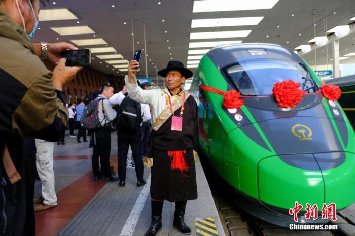 資料圖:民眾在拉薩火車站復(fù)興號(hào)車頭前拍照留念。 中新社記者 江飛波 攝