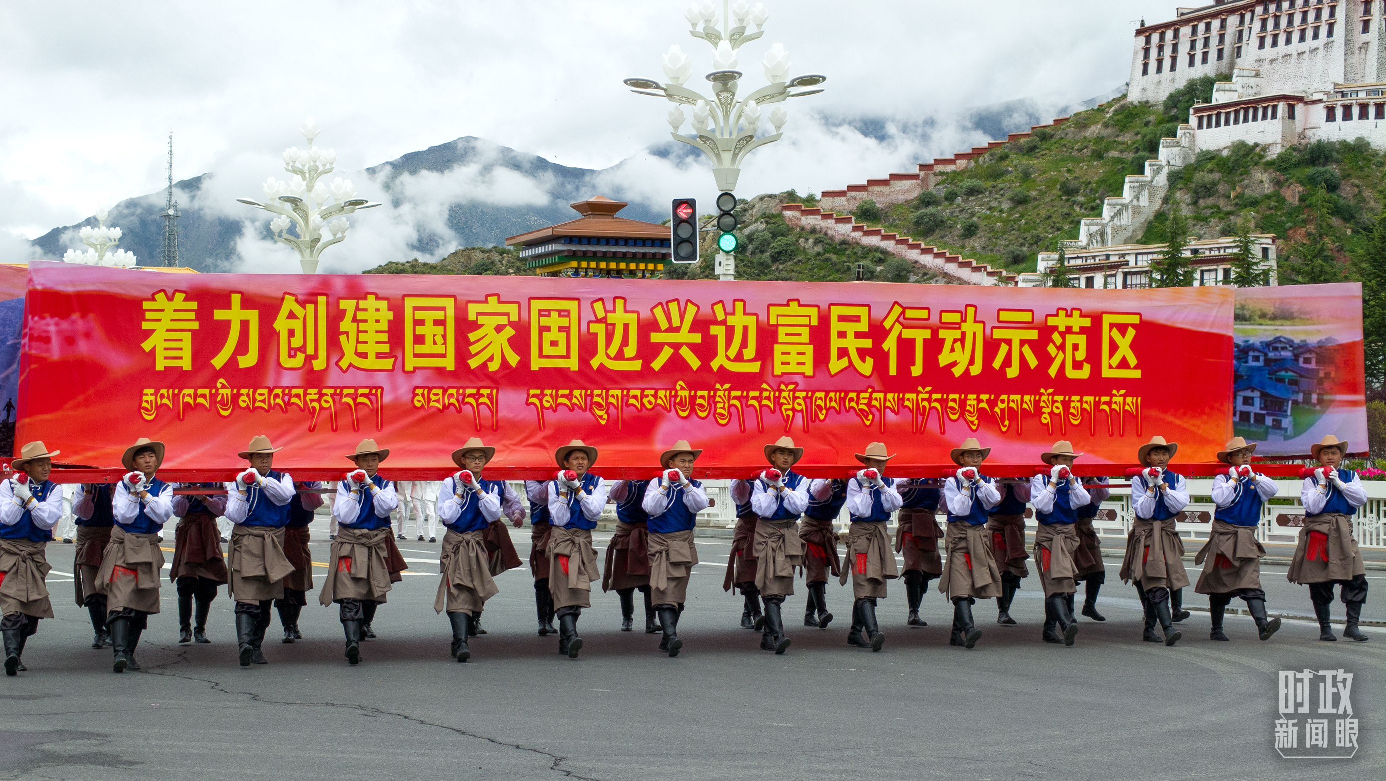 慶祝大會舉行盛大的群眾游行,分為“旗幟引領(lǐng)”“四件大事”“奮進(jìn)新時代”“走向未來”4個單元,26個群眾游行方隊(duì)、彩車,依次通過布達(dá)拉宮廣場。