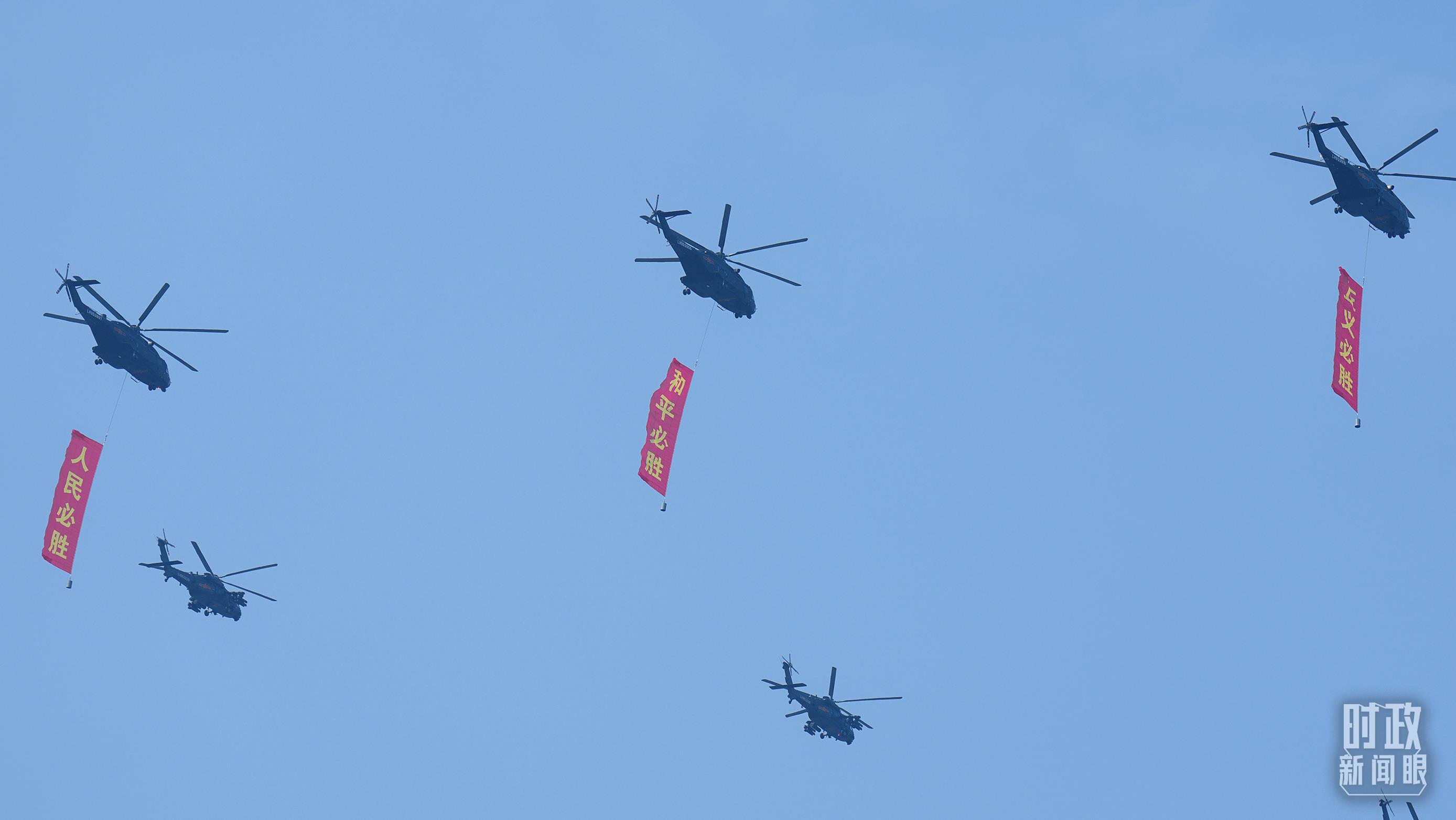 △9月3日,3架直升機分別懸掛“正義必勝”“和平必勝”“人民必勝”條幅飛過天安門廣場。(總臺記者李晉拍攝)