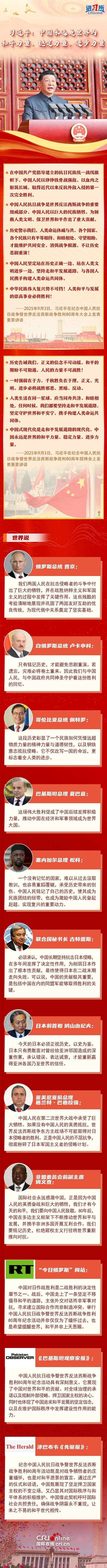 “中國(guó)永遠(yuǎn)是世界的和平力量、穩(wěn)定力量、進(jìn)步力量?!睆膭?chuàng)建聯(lián)合國(guó)到提出和平共處五項(xiàng)原則,再到推動(dòng)構(gòu)建人類(lèi)命運(yùn)共同體,中國(guó)始終面向光明,做世界和平與安全的堅(jiān)定維護(hù)者。國(guó)際社會(huì)高度評(píng)價(jià)中國(guó)為世界反法西斯戰(zhàn)爭(zhēng)勝利作出的巨大貢獻(xiàn),認(rèn)為抗戰(zhàn)不僅改寫(xiě)中國(guó)的命運(yùn),更標(biāo)志著全人類(lèi)的進(jìn)步;戰(zhàn)后的中國(guó)走上了一條堅(jiān)定不移倡導(dǎo)和平發(fā)展的道路,并以此次紀(jì)念活動(dòng)為契機(jī),呼吁國(guó)際社會(huì)共擔(dān)責(zé)任,確保戰(zhàn)爭(zhēng)陰霾永不重現(xiàn),讓來(lái)之不易的和平世代相傳。