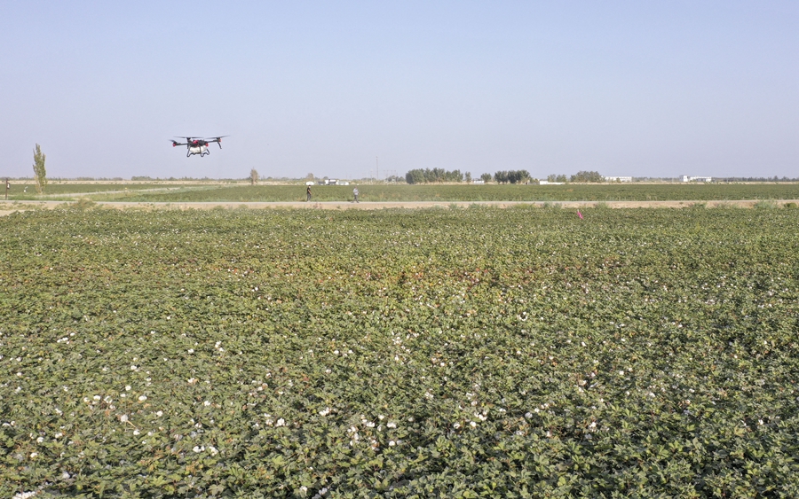 在新疆尉犁縣興平鎮(zhèn)達西村一處高標準農田,種植戶用無人機噴灑脫葉劑(2022年9月20日攝,無人機照片)。新華社發(fā)(汪志鵬 攝)