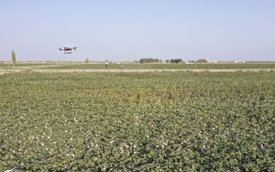在新疆尉犁縣興平鎮(zhèn)達西村一處高標(biāo)準(zhǔn)農(nóng)田,種植戶用無人機噴灑脫葉劑(2022年9月20日攝,無人機照片)。新華社發(fā)(汪志鵬 攝)