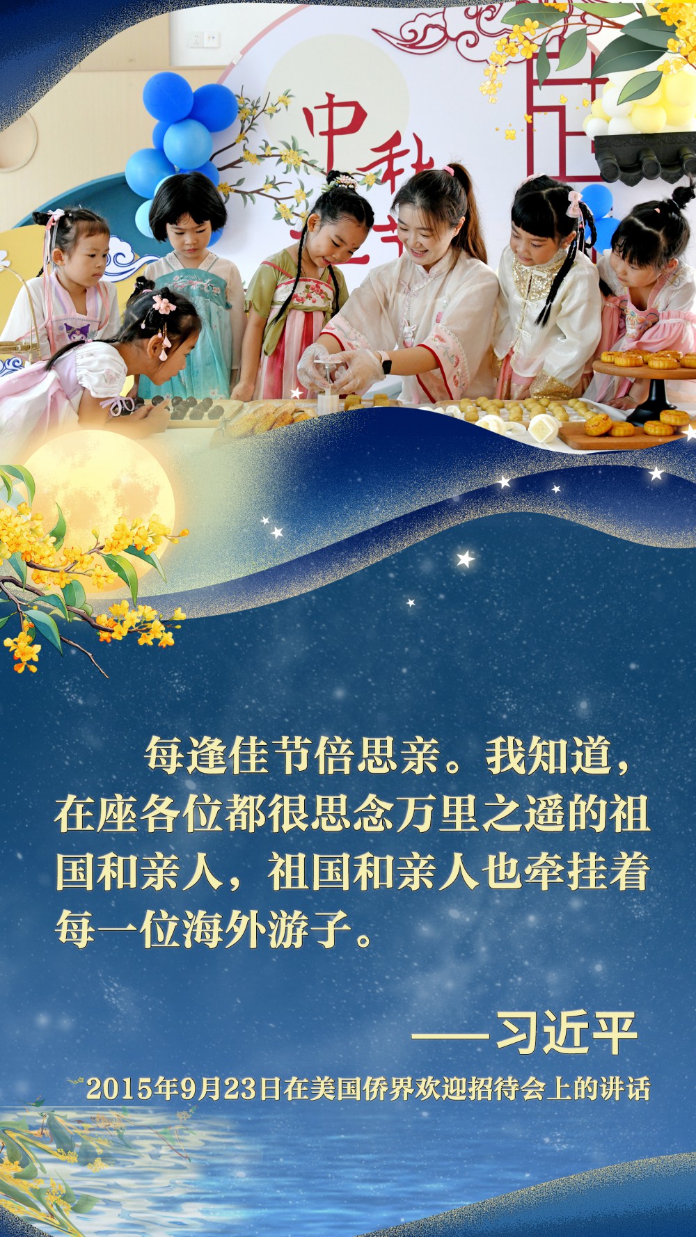 2015年9月23日,中秋佳節(jié)前夕,習近平總書記在西雅圖出席美國僑界歡迎招待會。他為參加招待會的同胞們帶去了來自家鄉(xiāng)的月餅,并熱情地“歡迎大家?;丶铱纯础?。
