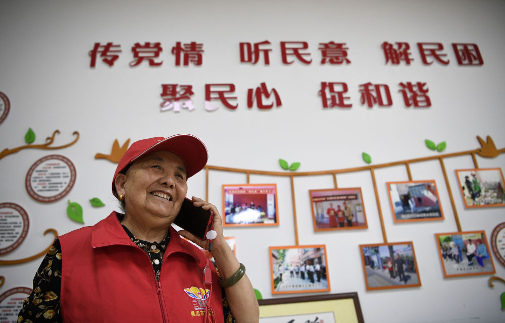 2019年11月29日,在浙江省湖州市織里鎮(zhèn)社會(huì)治理綜合服務(wù)中心調(diào)解室,“平安大姐”工作室的志愿者調(diào)解糾紛?!捌桨泊蠼恪眻F(tuán)隊(duì)運(yùn)用中華優(yōu)秀傳統(tǒng)文化中的“調(diào)解”思維,依靠親情、友情、鄉(xiāng)情“說和調(diào)?!保{(diào)解糾紛,化解矛盾。